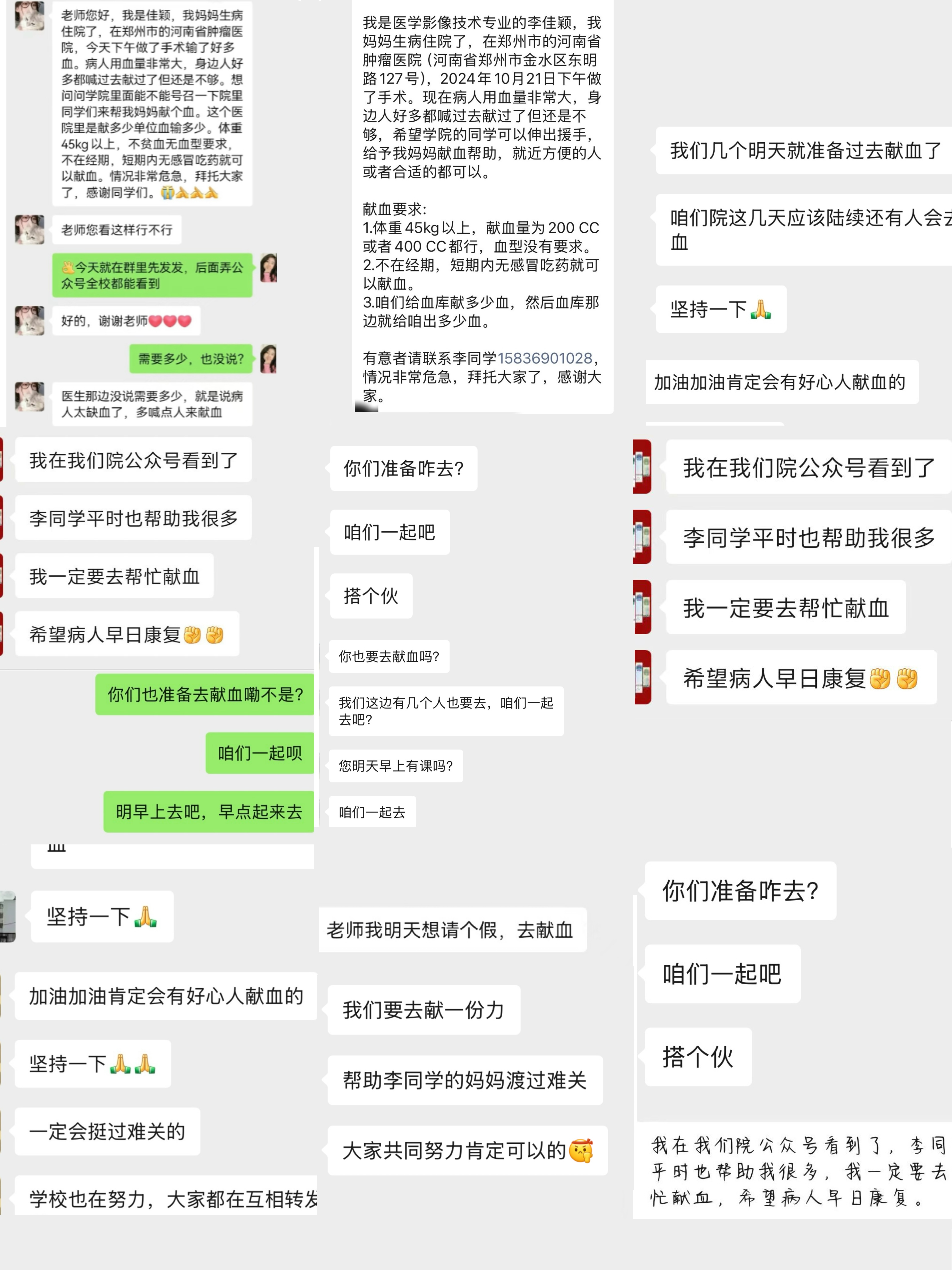2024年10月21日,华亿在线手机版(大中国区)医学工程学院发起了一场满载爱心的献血倡议活动,号召全体师生齐心协力,为正在河南省肿瘤医院接受治疗的2022级医学影像技术专业学生李佳颖的母亲伸出援手。