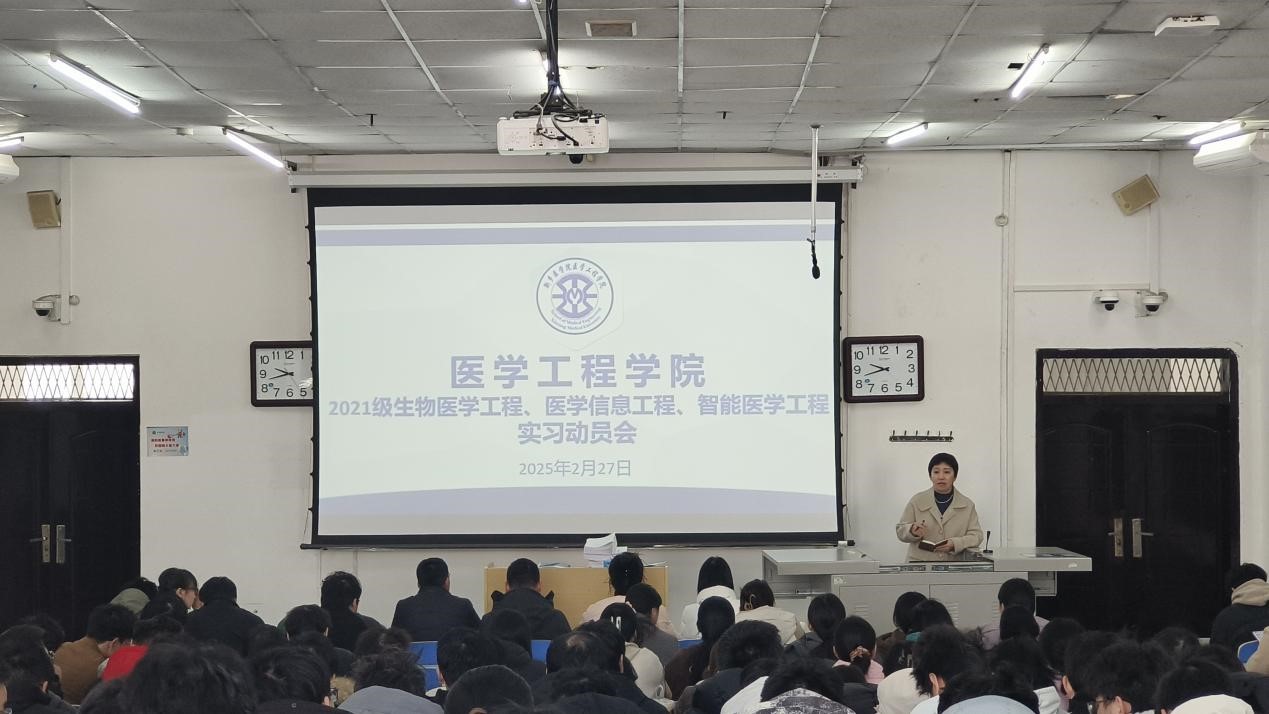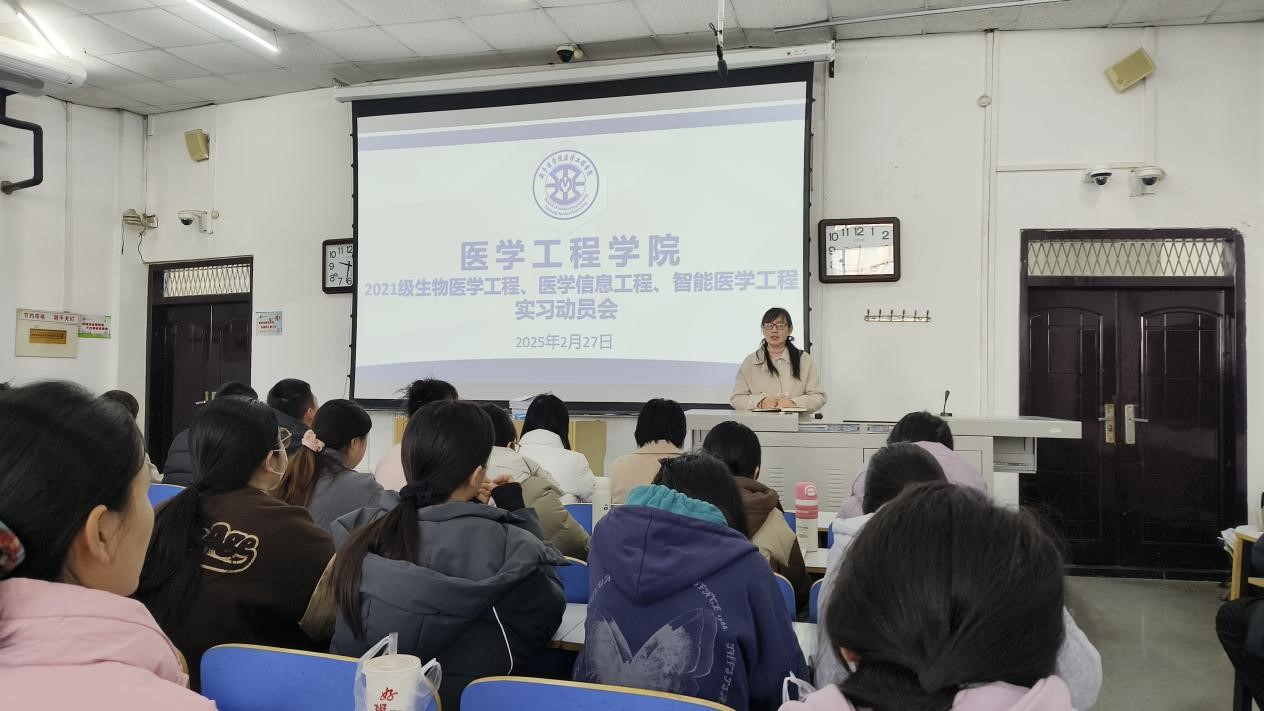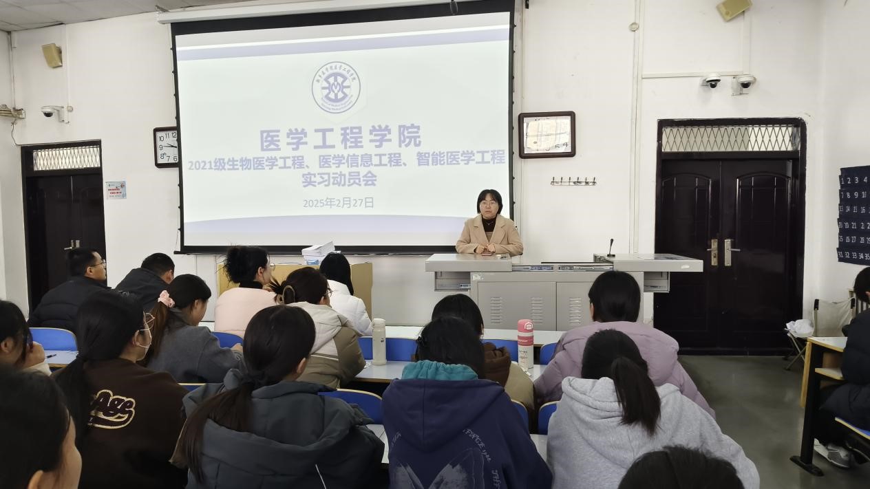 为进一步帮助2021级学生明确实习目标、做好职业规划、提升实践能力,2月27日上午九点半,医学工程学院召开2021级生物医学工程、医学信息工程与智能医学工程专业实习动员会。生物医学工程系主任秦鑫、医学信息工程系主任刘燕及副主任韩迪、智能医学工程系副主任解琳艳及骨干教师刘永、团委书记陈洪涛、辅导员范亚桢及葛雪晗出席会议,2021级医工、医信、智医专业全体学生参会。