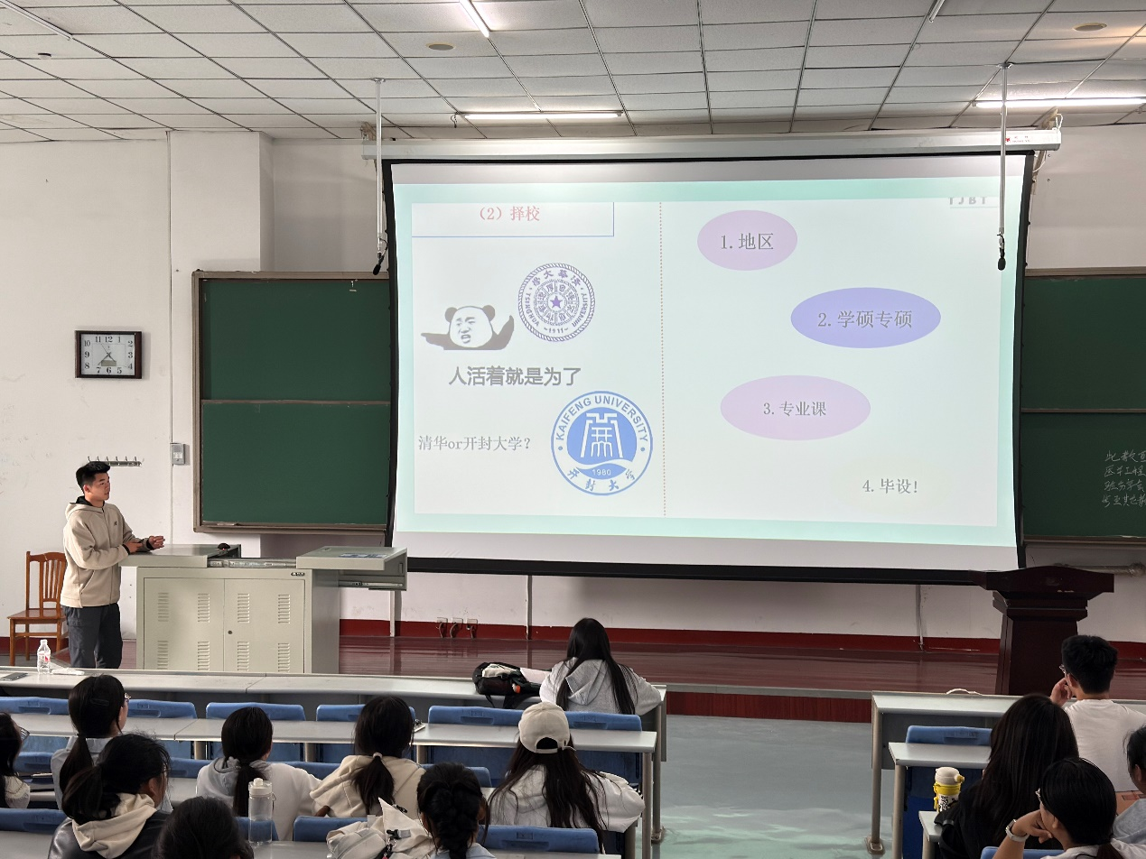 随后,考研顺利上岸的学长学姐依次登台,分享了他们备考过程中的宝贵经验与深刻感悟。他们依托自身经历,围绕择校思路、专业课划分、考研时间规划、复习方法论、备考资料筹备与信息搜集技巧,以及心理调适等多个维度展开了详尽阐述。在座的同学纷纷若有所思,并向其提出自己心中的疑问并得到了解答。每位宣讲者都强调了心态的重要性,考研之路实则是心态与意志力的双重磨砺,提醒大家务必保持坚韧不拔,学会有效释放压力、积极调整心态。