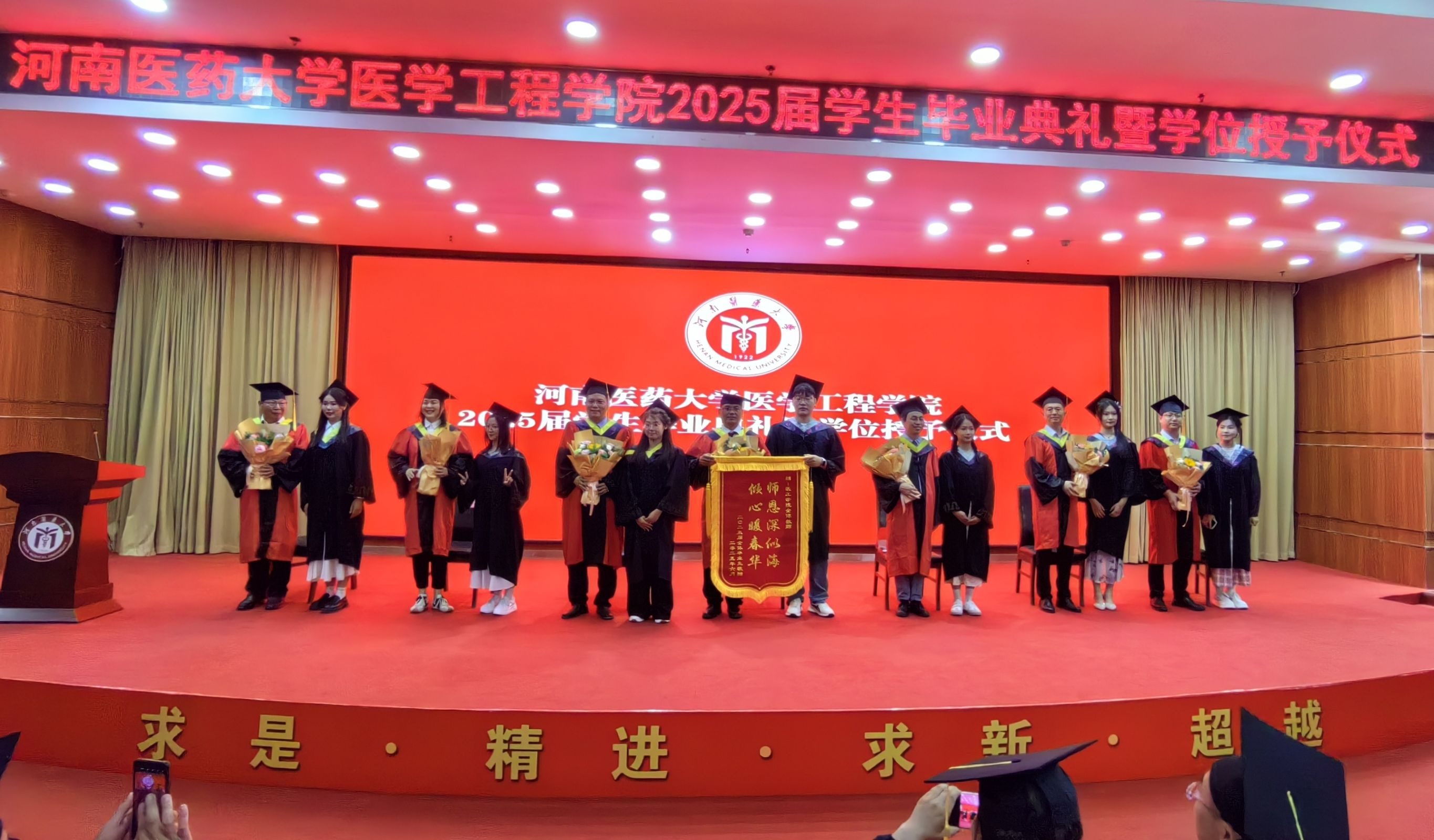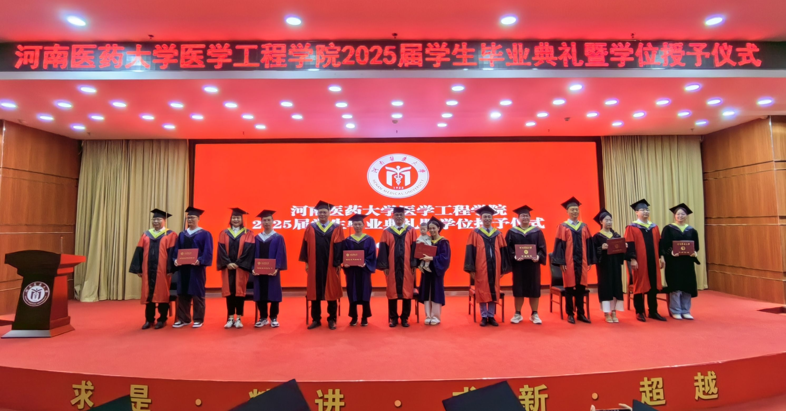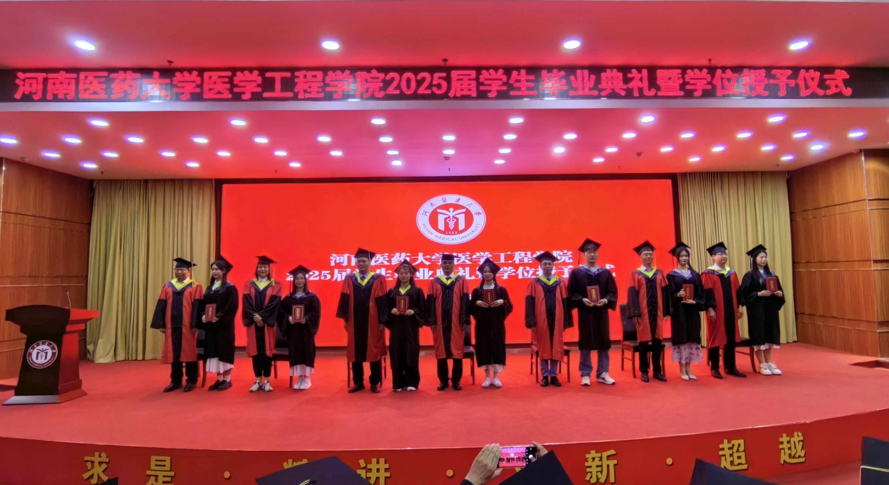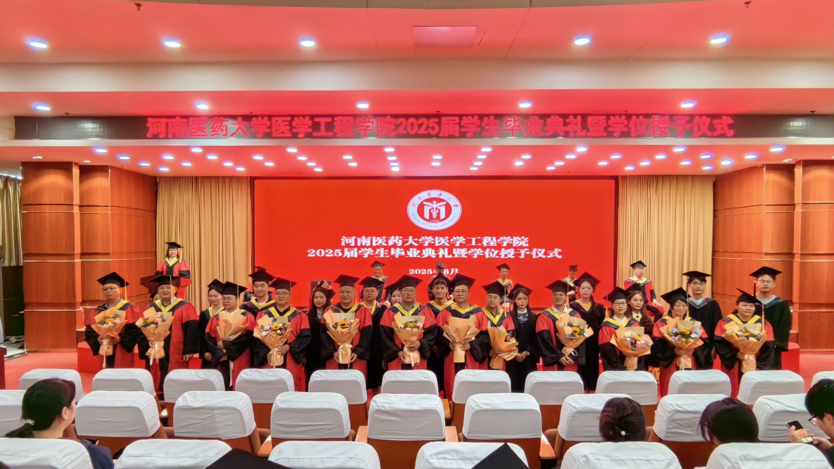 第一阶段毕业典礼结束后,学位授予仪式随即开始。校科技发展部主任、医学工程学院执行院长于毅宣读《河南医药大学关于授予2025届硕士毕业生硕士学位的决定》《河南医药大学关于授予2025届本科毕业生学士学位的决定》。医学工程学院党委副书记张洁宣读《河南医药大学学位评定委员会主席委托授权书》。在最激动人心的拨穗环节,学院领导为毕业生扶正流苏、合影留念,同学们身着学位服,面带笑容,正式完成从学生到校友的转变。