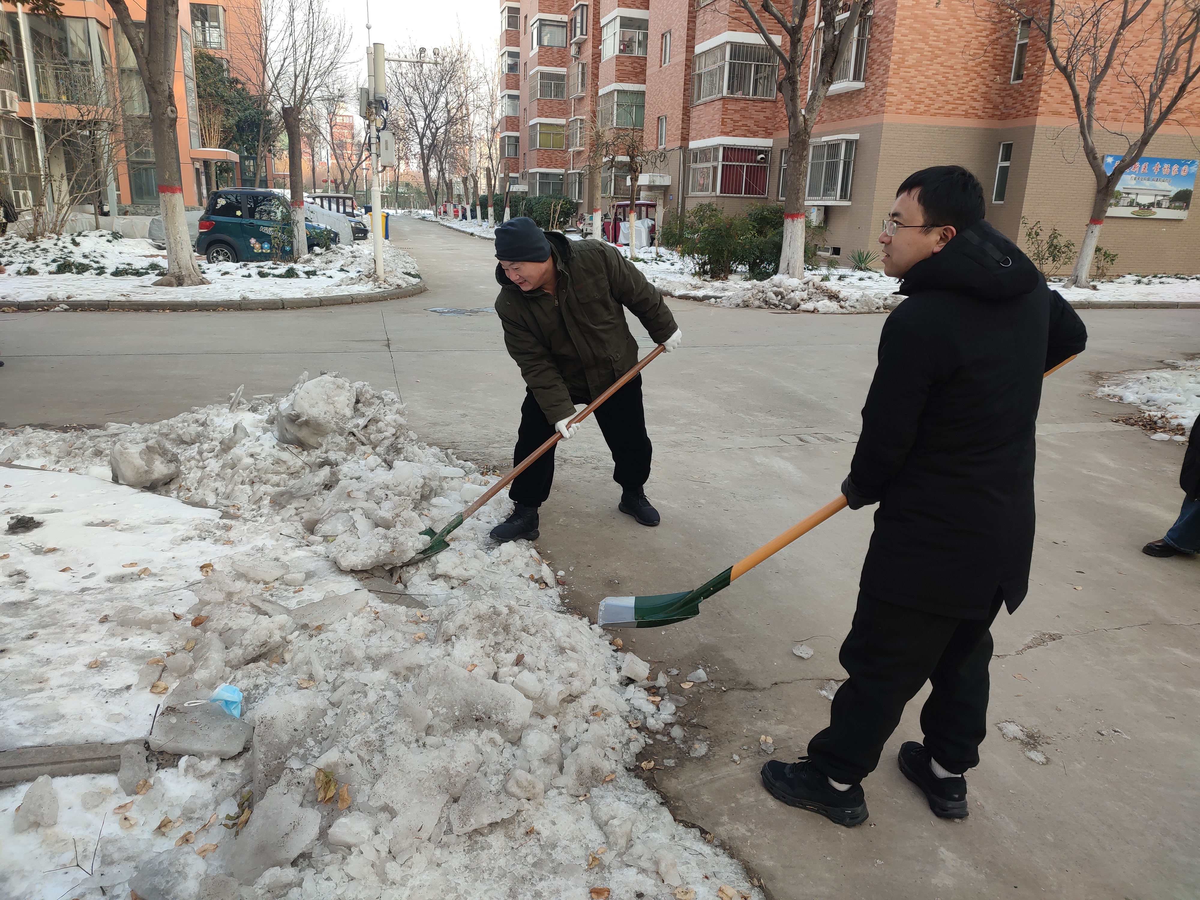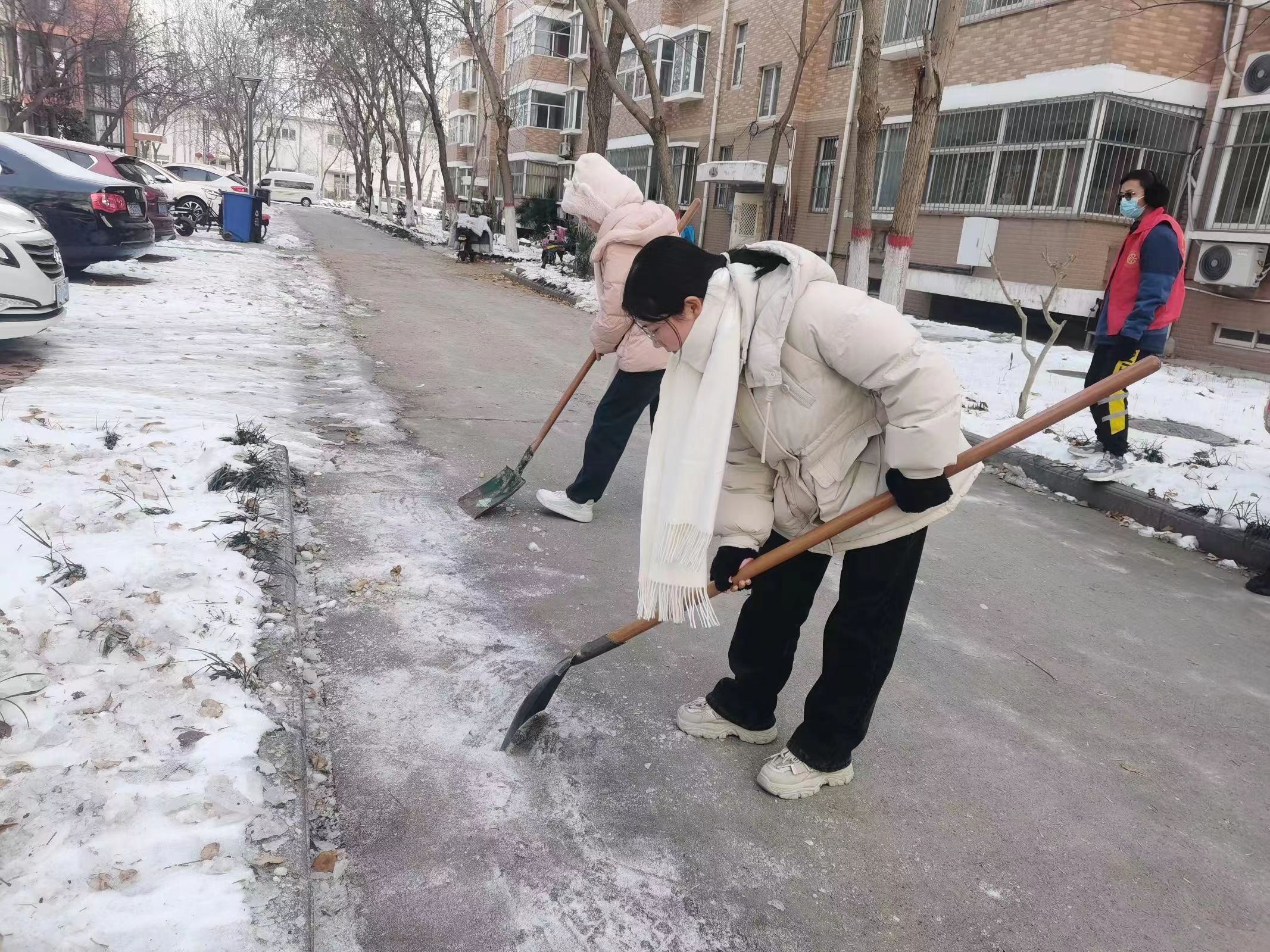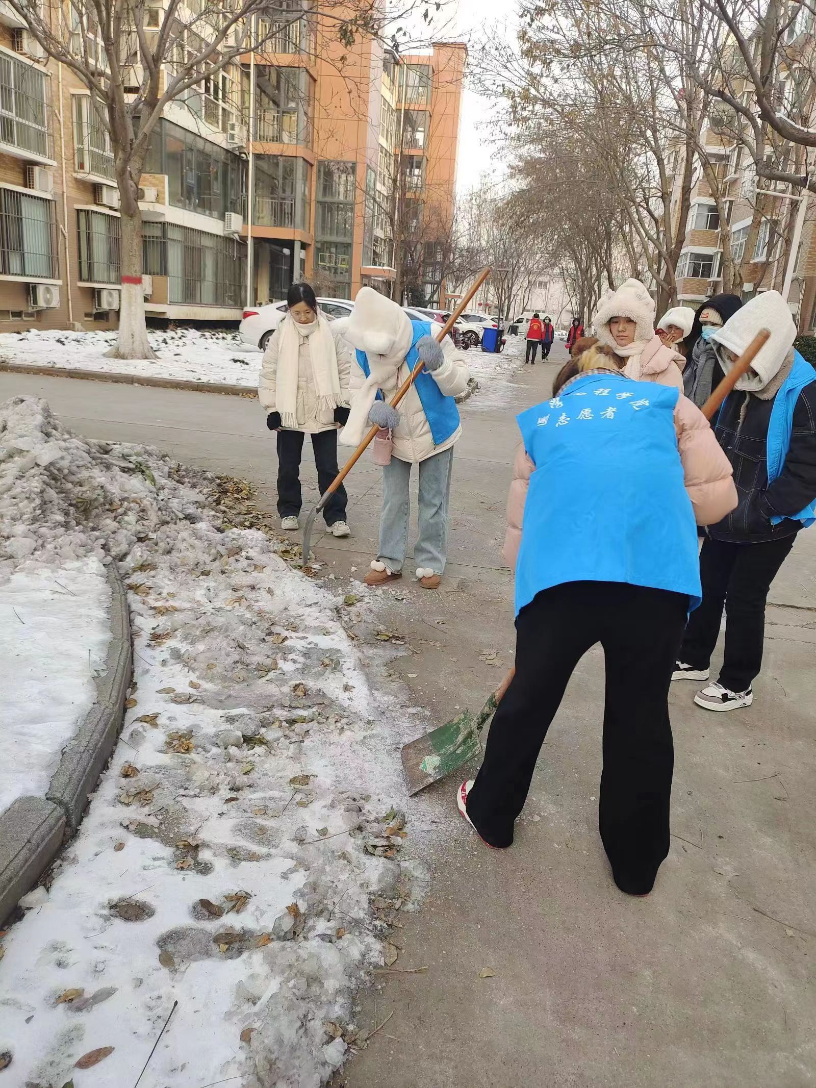 志愿者们挥动铁锹,同心协力,每一次挥动都使得路面清晰一分。众志愿者们辛勤劳动的身影,在这白雪皑皑的背景下构成了一道亮丽的风景线。面对严寒天气,志愿者们弯下腰,躬下背,各自分工明确,势要为师生清理出一条“安全线”。志愿者们奋战过后,路面寒冰已被清理,为行人的来往和车辆的通行提供了方便。同时,志愿者们的劳作也受到了师生和过往行人的赞美。