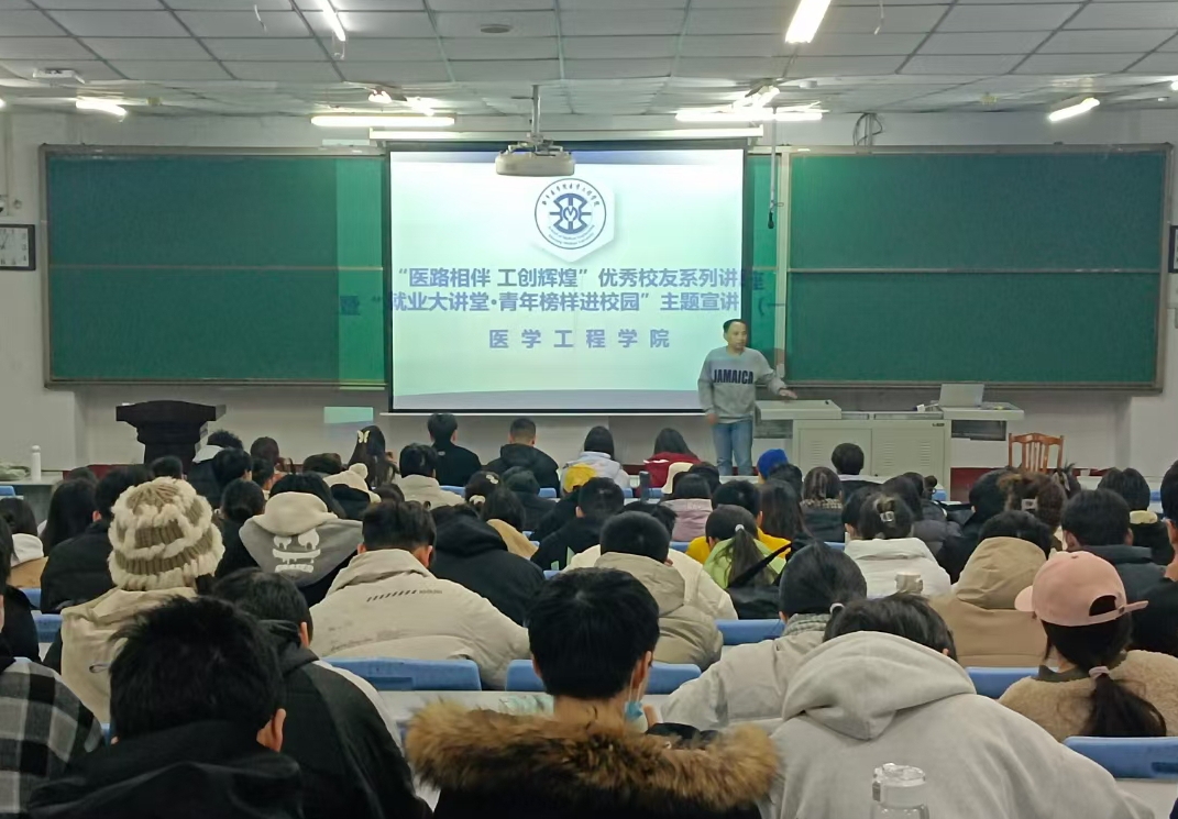宣讲之初,张启航同学通过线上交流的方式,向同学们介绍了自己的毕业到就业经历。张启航指出,在从校园走向社会时,心态的转变是第一步,要调整好自己的精神状态与生活作息,收敛自己的童心,积极适应社会。同时,在寻找心仪的工作期间,要开阔自己的视野,增加寻找工作的渠道,不局限于传统就业方式。鼓励同学们向国内外知名医疗器械公司投递自己的简历。保持自信的态度,一个阳光乐观,胸有成竹的面貌永远是自己的加分项。接着,刘振江同学登台向同学们进行宣讲。刘振江以自己为例,与同学们共情。在弱冠之年,不免对自己的未来充满迷茫与担忧,对自己的人生没有明确仔细的规划,并且不清楚自己将来要从事何种行业。一昧的跟风考研考公,只会耽误自己的青春年华。要对自己的人生有一个大方向,拒绝迷茫,去做什么都好,青春莫辜负。