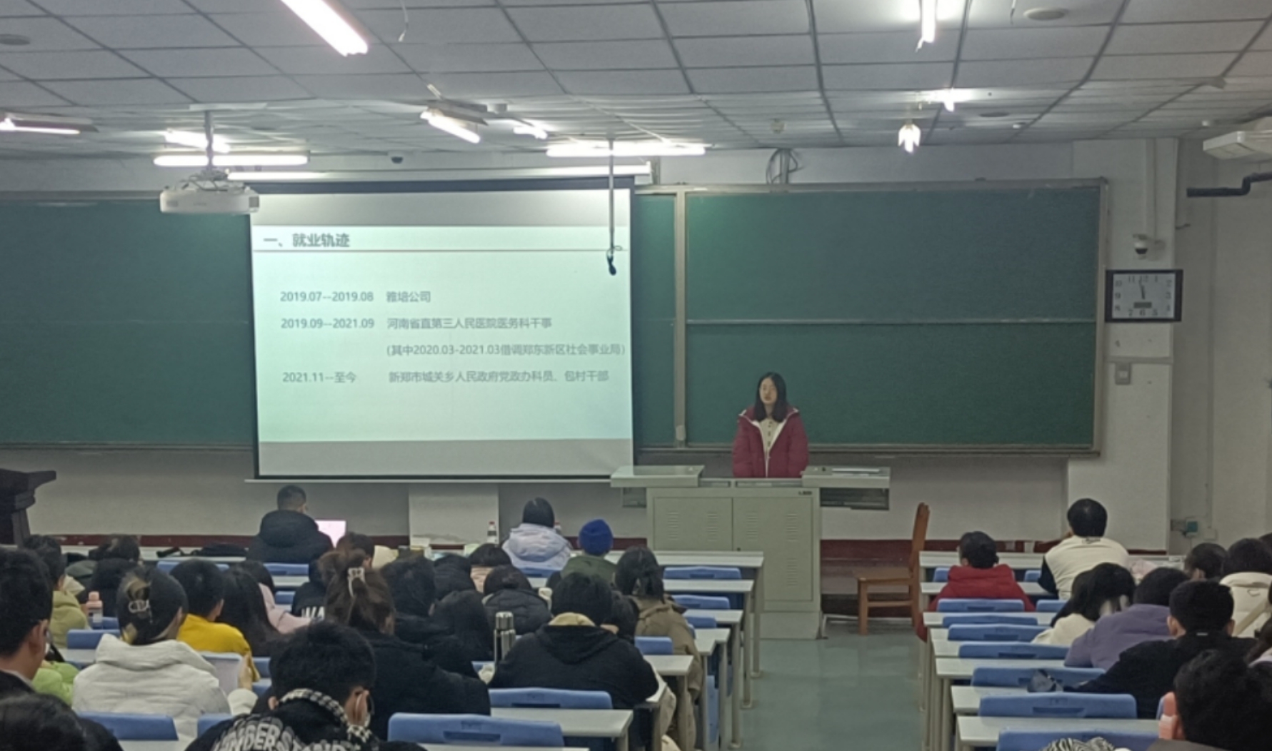 为帮助学生做好个人职业规划,引导学生积极在强国建设、民族复兴伟业中挺膺担当。我院于11月25日10点在3101开展了“就业大讲堂·青年榜样进校园”主题宣讲活动,特邀请三位优秀学长学姐为我们分享各自的就业选择和奋斗故事,对各种就业疑惑进行现场解答。本次宣讲活动团委书记陈洪涛,辅导员范亚桢主持,我院全体2021级学生参加宣讲。