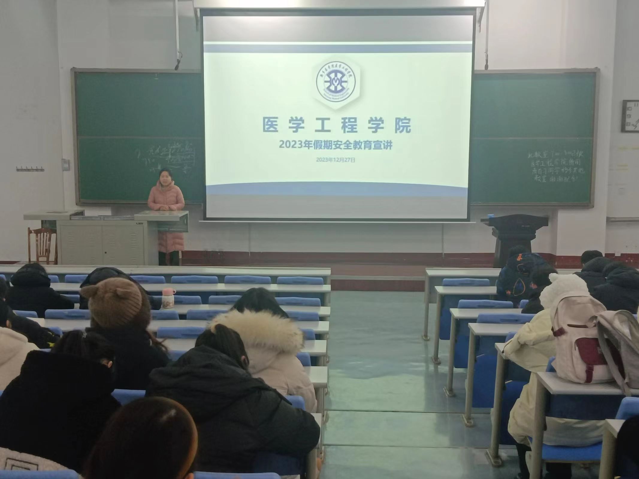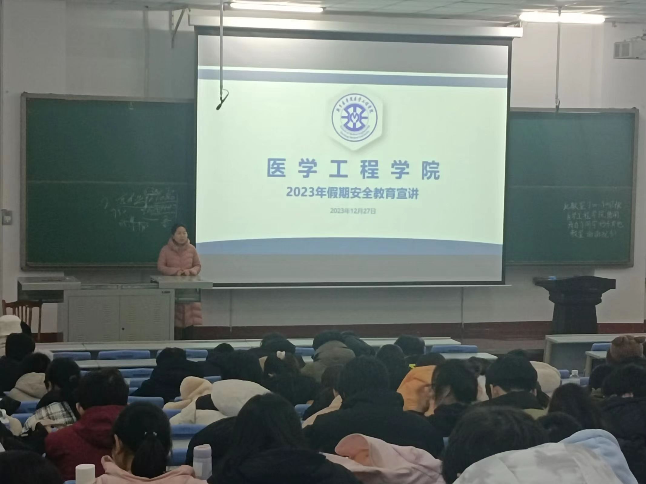 为持续推进学院安全教育建设,切实做好放假期间学生的安全教育和管理工作,12月27日晚7点,我院于三教D3教室举办2023年假期安全教育宣讲,医学工程学院团委书记陈洪涛、辅导员范亚桢主持,我院全体学生到场学习。