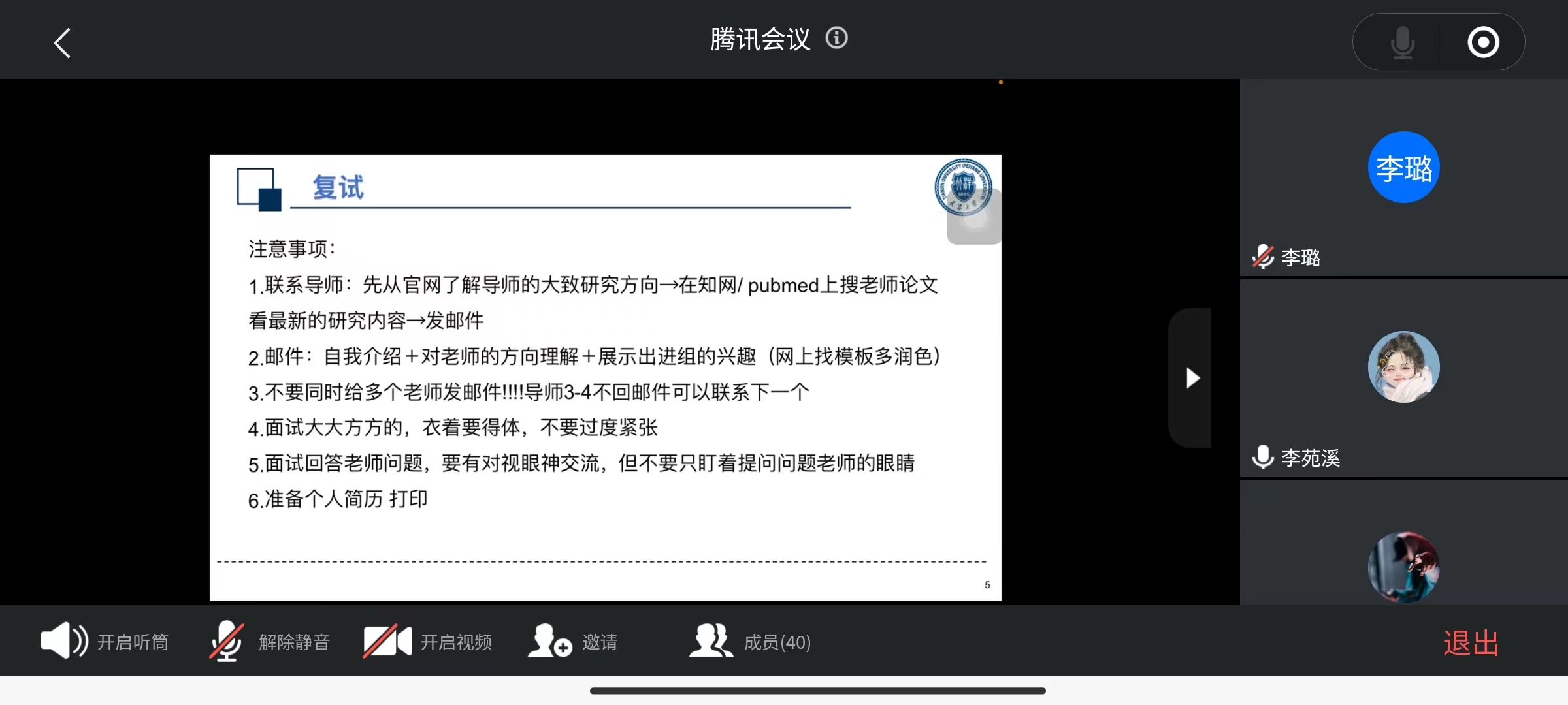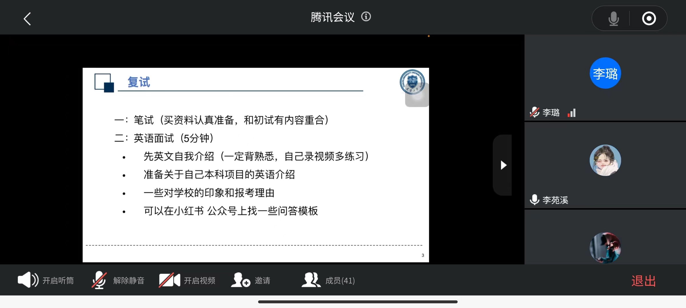 会议上学长学姐提到,面对复试时要积极准备,统计个人经历,流利的用英文进行自我介绍。注意自身的穿着打扮。设计自己的PPT,做到画面整洁,文字处理合理,图片组合风格统一。也分享一些面试技巧和答题策略,如何回答面试官的问题、如何展示自己的优势和特长等。在面对导师进行提问时,要有眼神交流,回答口齿清晰。对于自己的目标导师要有一定的了解。陈洪涛老师表示同学们一点心态调整和压力释放,放平心态积极备考。范亚桢老师对2024届考生表达了诚挚的祝愿,希望各位考生在最后的复试当中取得优异的成绩。