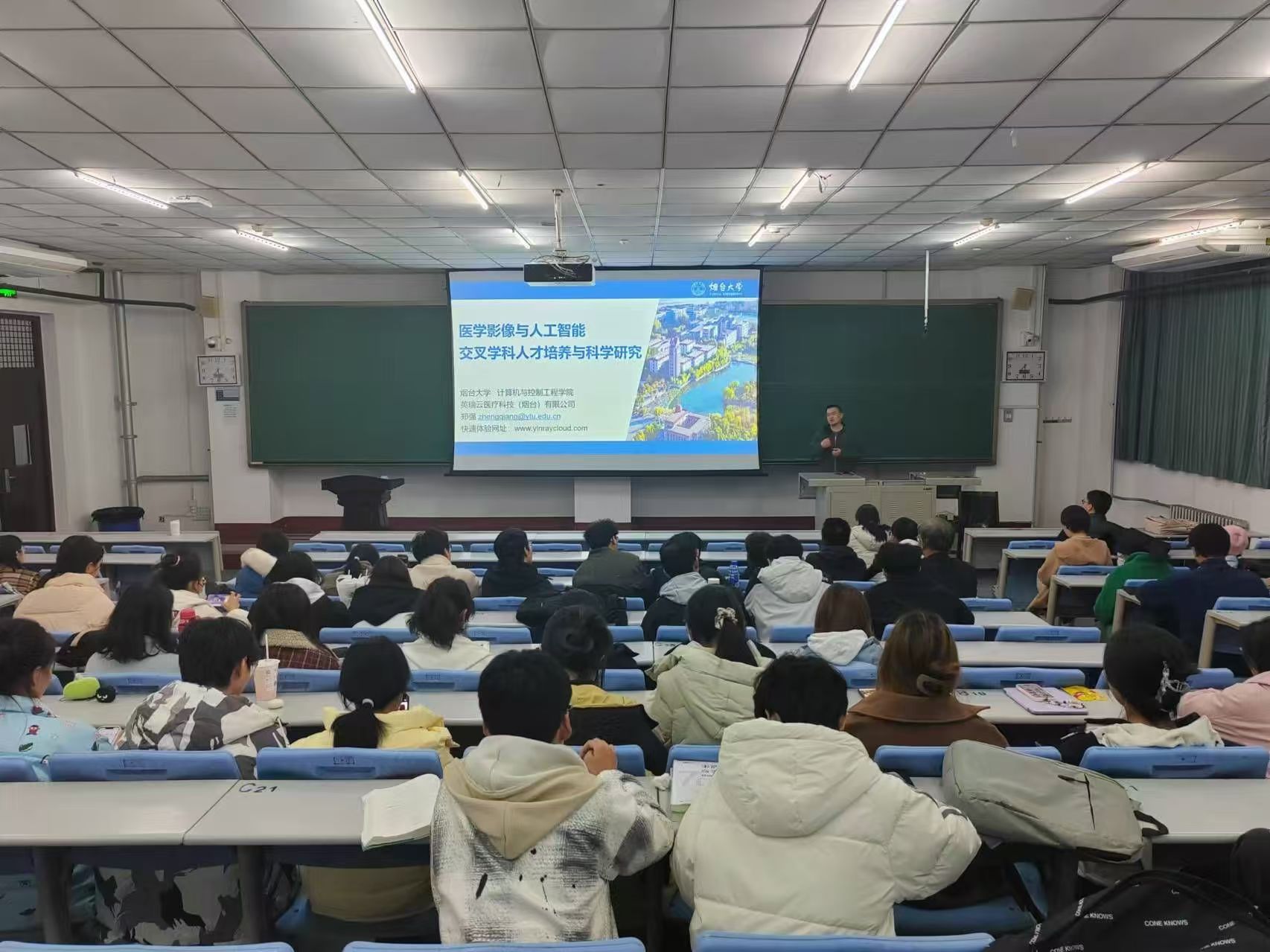 接着,郑强教授应邀作题为“医学影像AI开放创新平台研发与产业化”的学术报告,他结合自身的科研经历,从不同视角下的医学与人工智能交叉学科、创造生态 掌握科研主动权、关键共性技术与特色应用、医学影像AI知识体系与平台建设、开放创新平台衍生产品介绍等五个方面,详细介绍了医学影像与AI交叉学科建设的飞速发展,英瑞云医学影像AI开放创新平台的研发,平台在医学影像大数据云存储与云计算互联互通问题上的科技突破与关键技术,生动展示了人工智能技术在医疗领域的开放创新与应用,并阐释了智能影像工程专业理论与实践结合的重要意义,引导新生们要重视实践操作,夯实基础,提高综合素质能力。