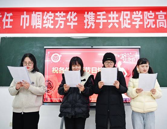 随后,学院4位学生代表学院研究生进行诗朗诵《巾帼礼赞》,献给学院女教师,诗中传递着女教师面对工作和生活的压力毫不退缩,勇敢担起“半边天”职责,学生的朗诵充满真挚情感,让在场女教师感到温暖,一切的付出都是值得的。