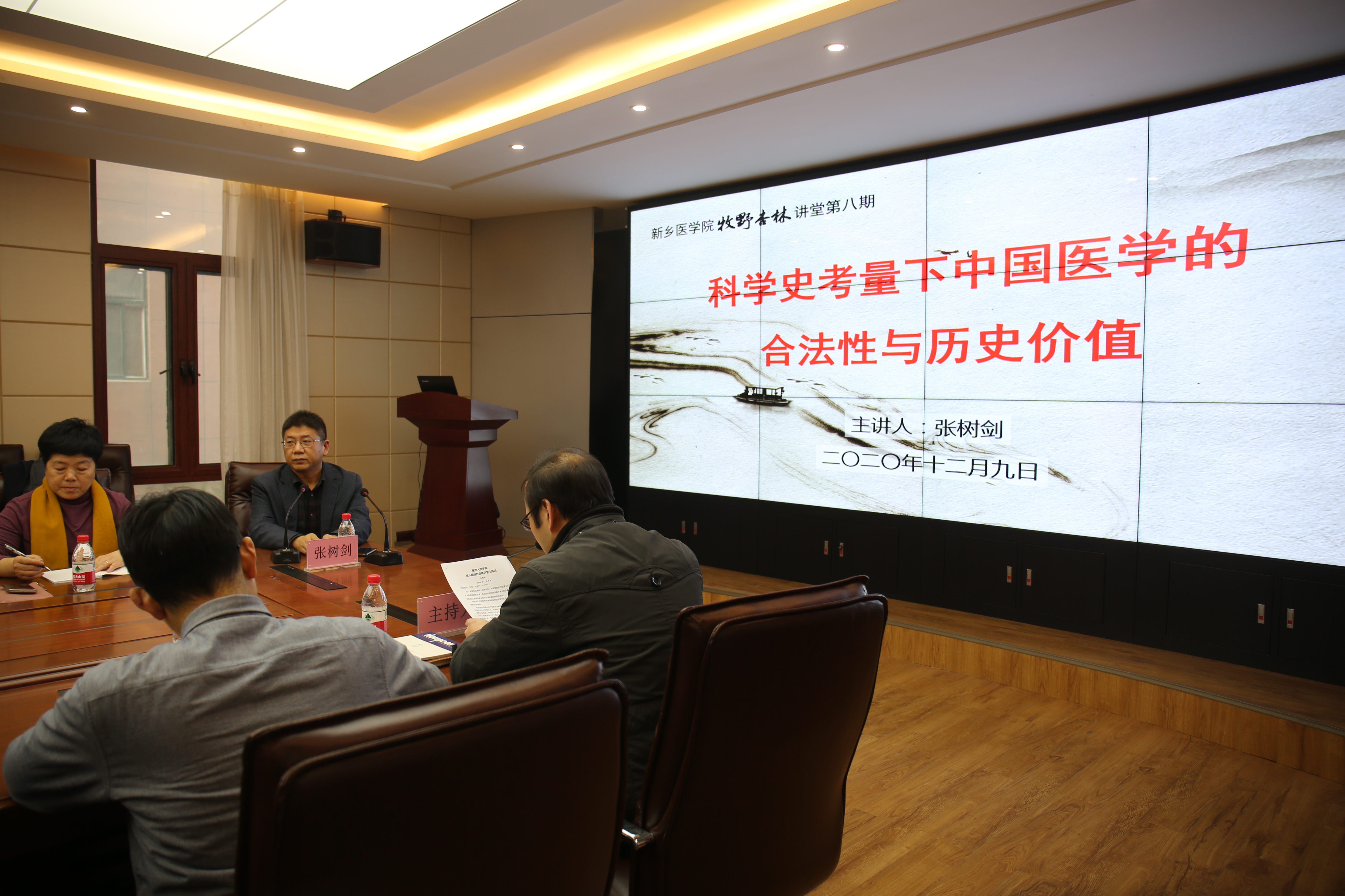 (文/段鹏超 图/郭玮)12月9日下午,我院主办的“牧野杏林讲堂”第8期在问学楼212举行。本次讲座由山东中医药大学张树剑教授主讲,讲座题目为《科学史考量下中国医学的合法性与历史价值》。学校相关院系师生约40人参加本次讲座,讲座由马院与人文学院党总支副书记史伟主持。