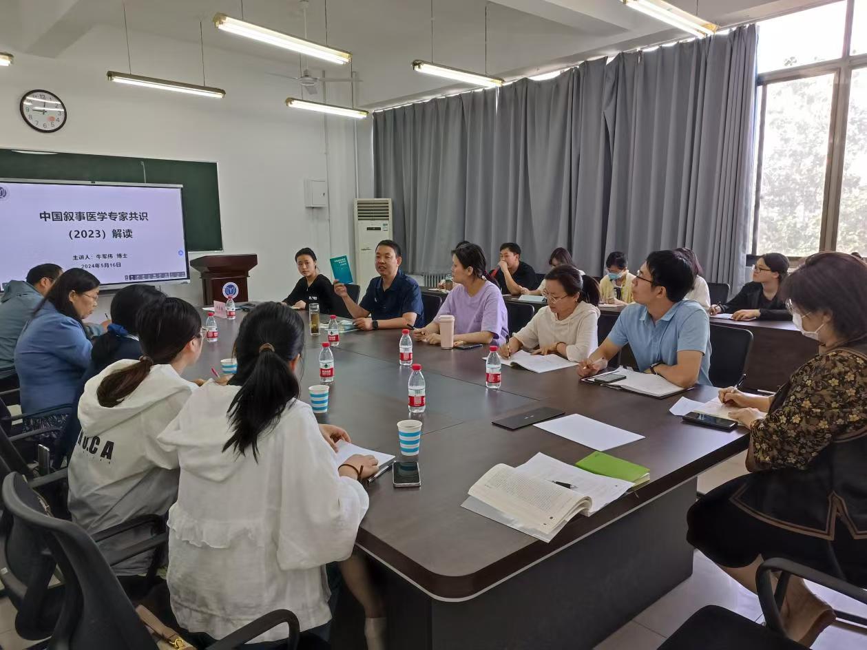 5月16日上午,由医学人文学院举办的“牧野杏林讲堂”第24期讲座在医学人文学院会议室举行。本次讲座由医学人文学院副院长牛军伟主讲,讲座题目为《中国叙事医学专家共识(2023)解读》。学院师生和校内外师生30余人参加了本次讲座。