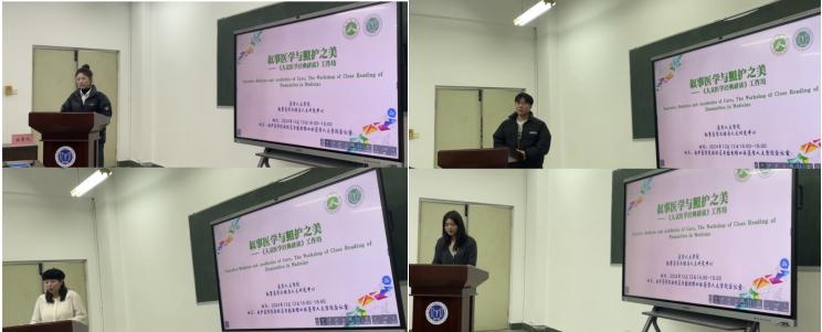 本次讲座以课程负责人牛军伟讲授拉开序幕,通过牛院长的讲授使我们意识到在医学的广袤领域中,我们不仅要专注于疾病的诊断与治疗,更要重视医学中的人文关怀。牛军伟授课结束后,学院2024级四位研究生分别进行了不同主题分享汇报,带领我们走进那些感人至深的医学故事,探寻其中的智慧与启示。随后,教师代表郭华主任引领大家剖析经典中的叙事医学理念,阐述如何通过文字走进患者内心世界,感受照护过程中的人性光辉。交流叙事医学在临床实践中的应用与挑战。