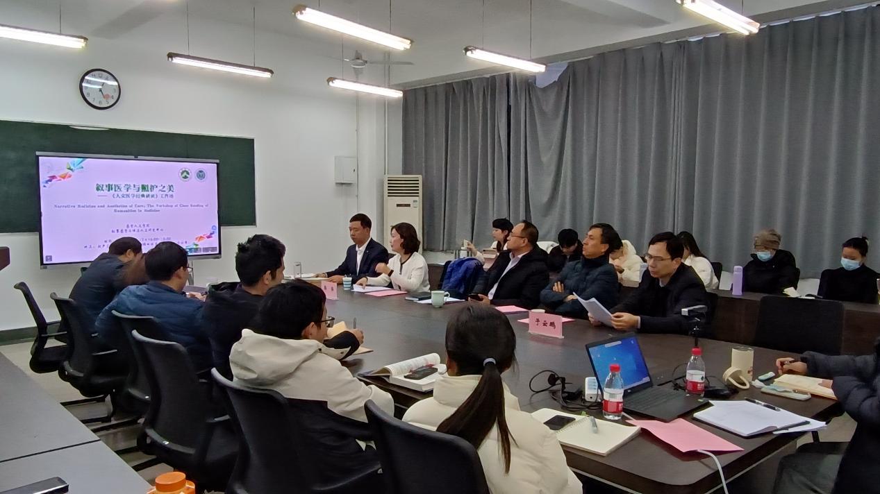 12月12日下午,由医学人文学院举办的叙事医学与照护之美--《人文医学经典研读》工作坊、人文医学课程群《叙事医学与照护美学》教育教学改革创新研讨会暨第30期讲座“牧野杏林讲堂”在医学人文学院会议室举行。本次讲座聚焦叙事医学与照护之美,旨在深入挖掘人文医学内涵,提升医学专业人员的人文素养与共情能力,吸引了众多医学领域从业者、学者及学生踊跃参与。党委研究生工作部、研究生学院副部长于云鹏,新乡市中心医院肿瘤科主任、安宁疗护负责人郭华,学院直属党支部书记孔磊,院长李新国,副院长牛军伟参加此次活动。