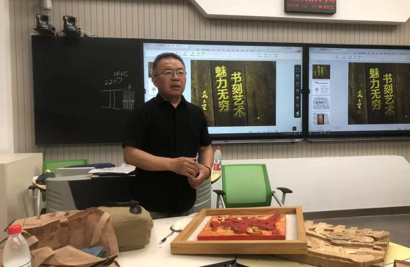在讲座中,范玉星介绍了传统匾额和现代刻字的样式、艺术特征以及作品所富含的丰富文化内涵,让大家感受到,刻字艺术是中华文明长河中的璀璨明珠,是完美融合书法意蕴、雕塑语言和当代审美的艺术,并分享了其刻字作品“牧野之战”“沙场秋点兵”的创作灵感、思路,并给大家演示了实操过程。