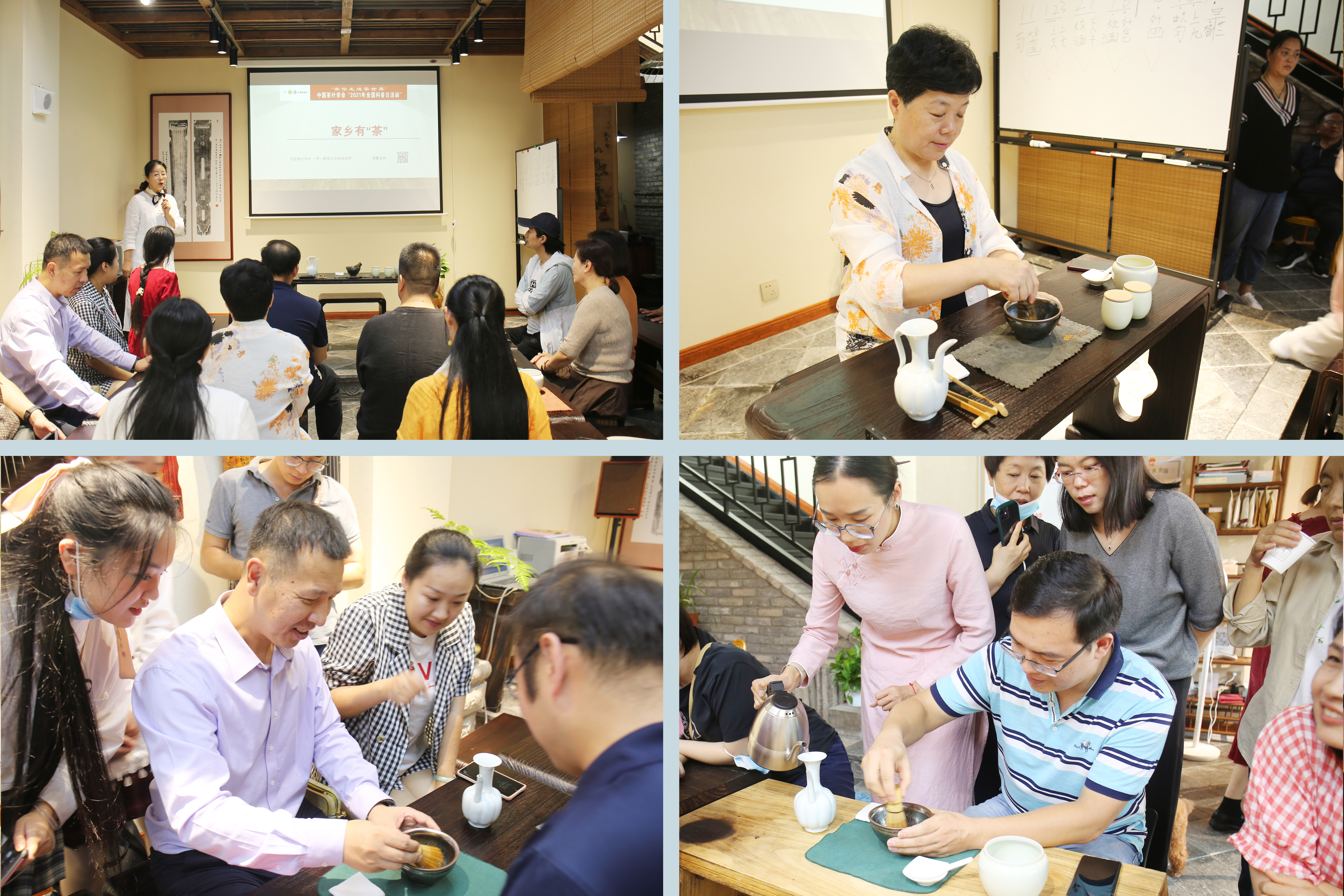 中国茶叶学会"一带一路"茶文化科普讲师李海霞承接第三项活内容,茶道讲习《家乡有茶》,讲授传统茶文化与宋代点茶程序与技巧,并邀请在座教师分组亲手体验点茶茶趣,她引导各位老师点评各小组点茶成果并分茶品尝,又使各位老师体会到斗茶的乐趣。