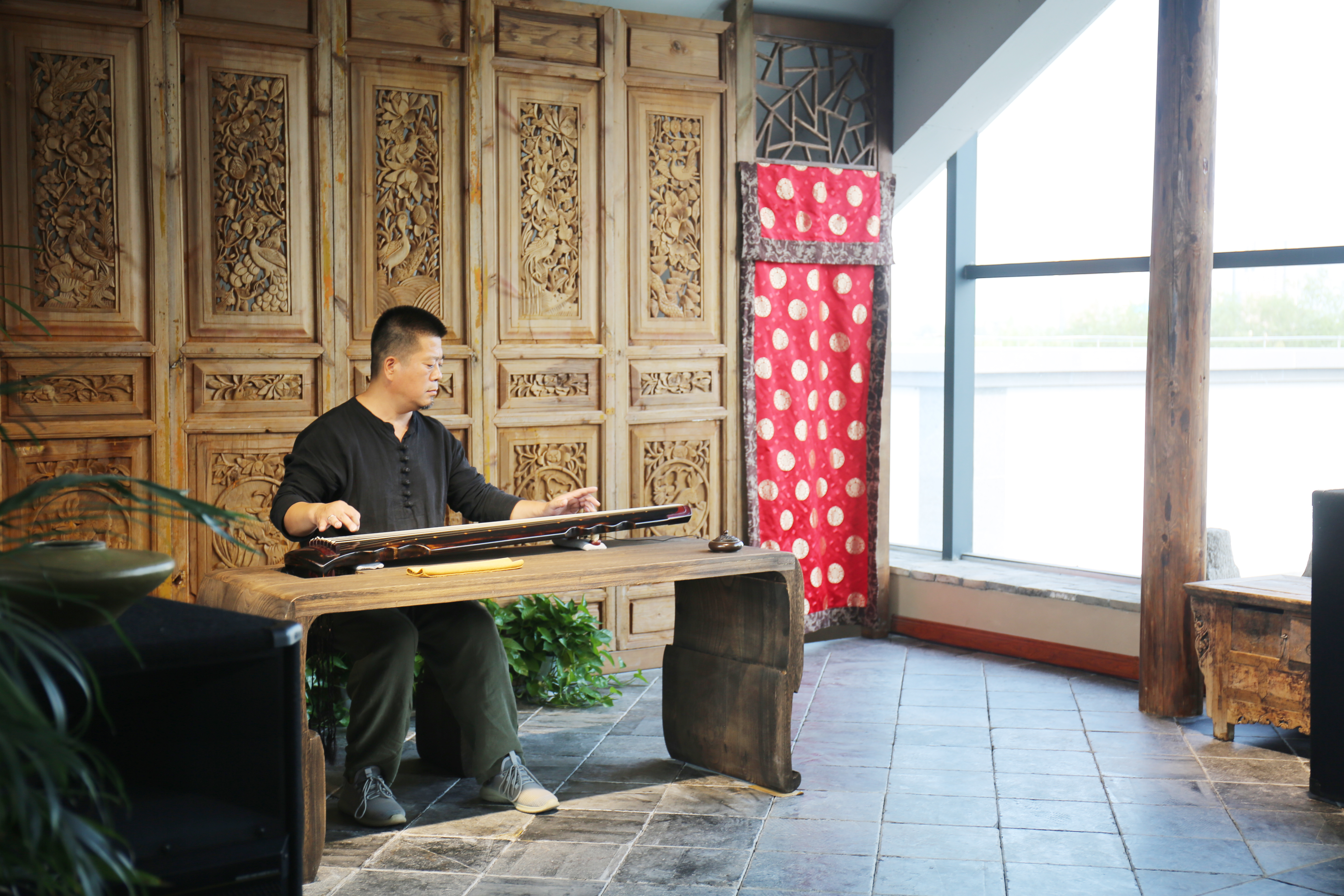 本次文化活动共分三场,首先于琴厅欣赏由河南省管弦乐协会古琴专业委员会理事郭光普先生演奏古琴。《普庵咒》雅畅清逸,质朴平实,颇有庄严肃穆之感;《流水》则如淙淙的山泉,潺潺的溪水,汇入江流,一泻千里。两首曲调一静一动,动静结合,使听众由清净安宁的情感转到狂草泼墨的动态美感联想之中。