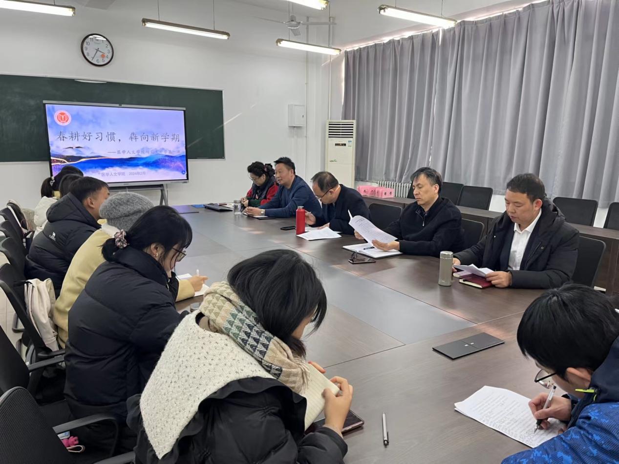 新春伊始,万象更新,学院也迎来了新的学期。为了做好研究生培养管理教育工作,2月28日下午,学院在会议室召开2024年春季开学第一次主题班会暨安全稳定工作会议。医学人文学院直属党支部书记孔磊、院长李新国、副书记郭跃伟、副院长牛军伟、导师郭玮、导师李静、班主任臧佳莉及学院全体在校研究生出席本次会议。会议由副书记郭跃伟主持。本次班会的主题为“春耕好习惯 • 犇向新学期”。