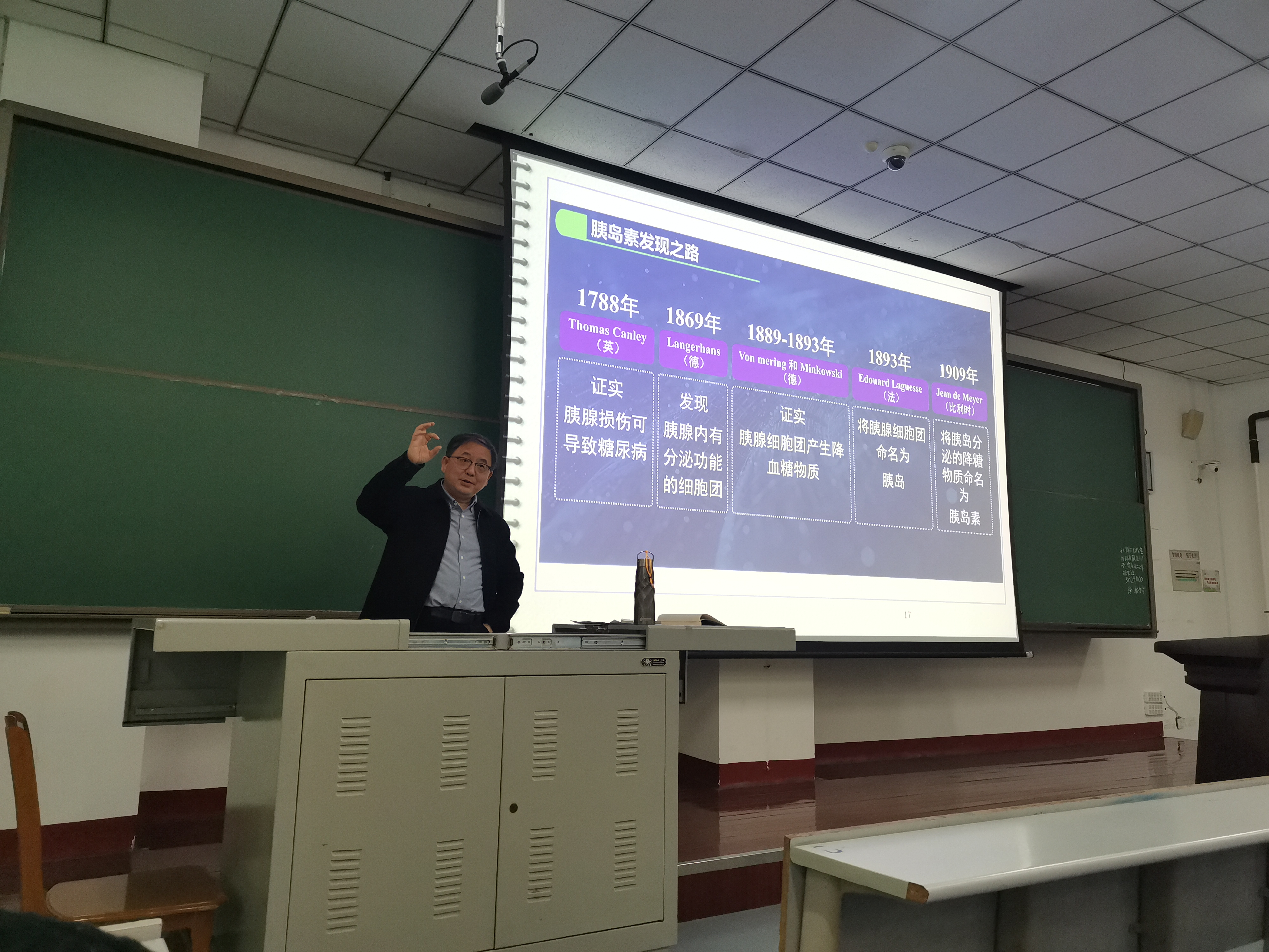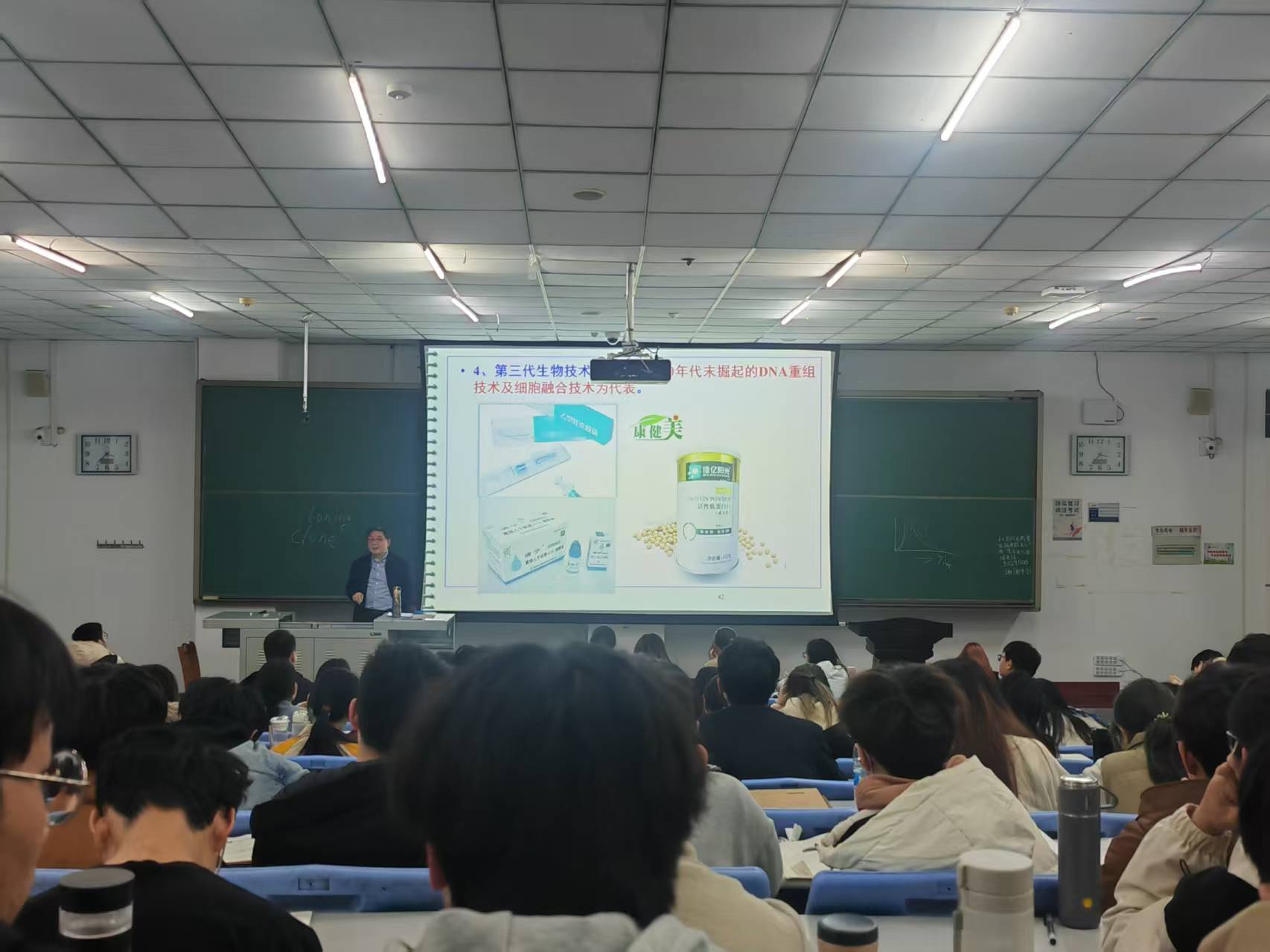 华子春教授以饱满的热情为同学们深入浅出地讲解了天然胰岛素从发现到临床转化,再从基因工程胰岛素到蛋白质工程胰岛素产品迭代更新的发展历程和精彩的生物技术创新创业生动案例,充分阐述了生物工程下游工艺对生物药品生物质量、用药成本以及大众可及性的关键作用。他巧妙地将复杂的专业知识转化为通俗易懂的语言,引导同学们深入思考"生物工程下游技术与提升人类健康的关系"、"未来生物技术及其下游技术的发展方向"以及“生物技术创新创业离我们今天的学生有多远”等重要议题。在课堂互动环节,华子春教授与同学们就生物工程下游技术涉及的多个学科展开探讨,特别是生物化学与分子生物学之间的区别与联系。同学们踊跃发言,从分子的结构与功能的角度阐述了生物技术发展对人类健康的重大贡献及其在国民经济中的重要地位。华子春教授还通过青霉素的发现及其在"二战"期间发挥的重要作用并获得诺贝尔奖这一典型案例,生动展示了生物技术“改变生活、影响未来”的深远影响。这堂内容丰富、精彩纷呈的课程不仅拓展了同学们的学术视野,更加坚定了他们在生物工程及其下游技术深耕细作的信心与决心。