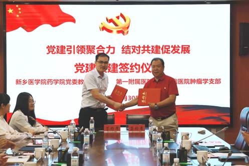 为深入贯彻落实党的二十大精神,进一步探索党建引领高质量发展新路径,深入推进“一融双高”,有效实践校党委组织部发起的“党建引领、结对共建”的基层党建新模式。5月30日,以药学院党委教工第三党支部与第一附属医院党委肿瘤医院肿瘤学支部为试点的党建共建签约仪式在一附院顺利召开。学院党委书记贾岩龙、院长房立真、第一附属医院党委副书记赵广志、肿瘤医院院长路平出席活动,校党委组织部组织科科长李常艳到会指导。第一附属医院党委组织部、肿瘤医院相关领导、两个共建支部党员代表共30余人参加活动。共建仪式由肿瘤医院党总支书记杨智华主持。