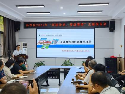 2022年9月9日上午,药学院“师脉传承,师道赓续”主题报告会在会议室举办,我院河南省教学名师孙祥德教授作专题报告。学院党政班子成员及全体药学院教师参与学习与交流。院长白素平主持报告会。
