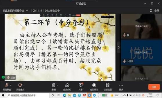 9月12日,学习部和主持团在钉钉群聊通过线上视频会议共同举办了绕口令大比拼的活动,参加本次比拼的学生共有28名。比赛分为两个环节。第一环节(我最标准):参赛选手在主持人的引导下随机挑选数字,抽选出一段绕口令并读出,评委根据参赛选手的普通话标准程度、流畅程度以及准确程度进行打分。在选手们的激烈比拼下,评委们最终评选出十名参赛选手晋级到下一环节。通过一轮的筛选氛围变得紧张而激烈。第二环节(争分夺秒):由主持人公布考题,参赛选手按照题目读出绕口令。按照完成时间顺序进行排名。比拼中选手们口齿清晰、发音准确,充分的体现出普通话的魅力。本次比拼设置一等奖1名、二等奖1名、三等奖1名、优秀奖3名。