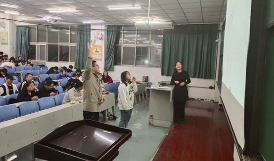 中场休息,团委学生会主席马天佑组织大家进行击鼓传花的小游戏,游戏进行过程中,同学们的热情被调动起来,被选中的同学纷纷进行自我介绍,现场气氛热烈。