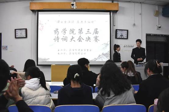 正值中国共产党成立一百周年,为加强爱国主义教育,弘扬中华民族的优秀传统文化,感受传统文化的博大精深,药学院学生会网宣部于11月21日下午3点在第二教学楼2101教室举办了以“诵千古诗词,品赤子情深”为主题的《中国诗词大赛》决赛,学生会团委副书记梁茹、学生会主席马天佑和三位学生干部代表出席,20级和21级部分同学参加此次比赛。