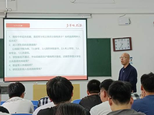 宣讲中,张楠老师对本科生参军入伍的最新政策变动、年龄和身体条件要求、各项优待政策、报名时间和方式等做了详细介绍。随后晋海超老师就到场学生提出的征兵名额、职业军人待遇、入伍后的职业发展等问题进行了答疑。