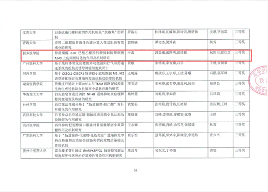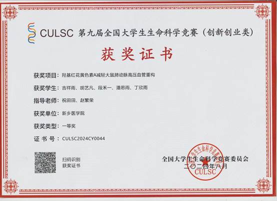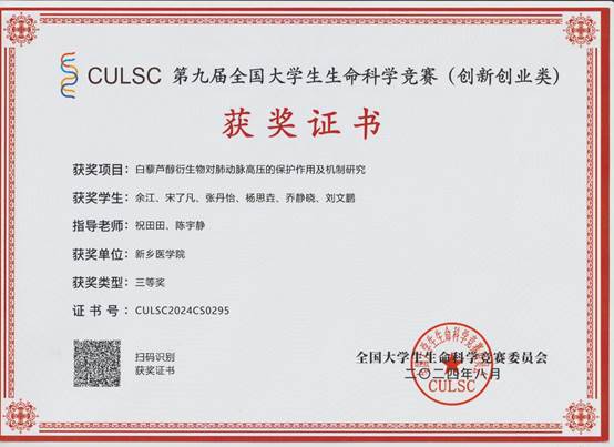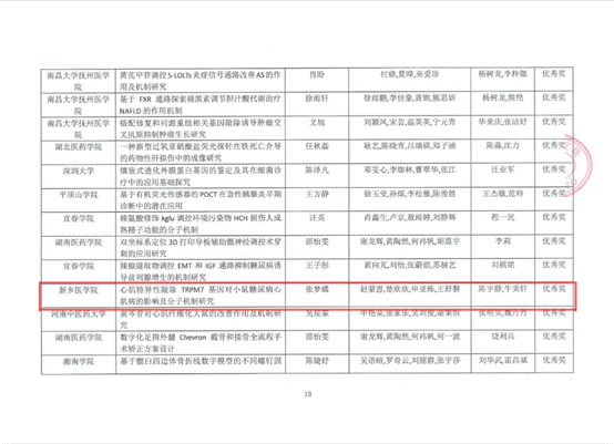 药学院祝田田、赵繁荣老师指导,学生潘思雨等人参与的项目《羟基红花黄色素A减轻大鼠肺动脉高压血管重构》荣获全国一等奖;祝田田、陈宇静老师指导,学生刘文鹏等人参与的项目《白藜芦醇衍生物对肺动脉高压的保护作用及机制研究》荣获全国三等奖;祝田田、徐红彦老师指导,学生于淼等人参与的项目《异甜菊醇8-Br己酸乙酯羟肟酸抑制肺癌细胞A549上皮间质转化的作用及机制研究》荣获省级复赛三等奖;陈宇静、牛秉轩老师指导,学生张梦蝶等人参与的项目《心肌特异性敲除TRPM7基因对小鼠糖尿病心肌病的影响及分子机制研究》荣获省级复赛优秀奖。