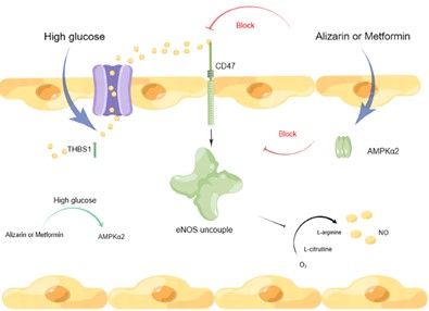 针对上述问题,河南省心血管重构与药物干预国际联合实验室进行了深入研究。研究发现:①茜素阻断高糖诱导的THBS1合成的增加;②茜素通过激活AMPK通路和抑制THBS1-CD47复合物的eNOS活性来降低CD47的表达;③茜素增加NO水平来改善血管损伤。该研究对于缓解Ⅱ型糖尿病、改善Ⅱ型糖尿病内皮功能障碍、为治疗Ⅱ型糖尿病提供新的靶点和开发新的潜在药物具有重要意义。