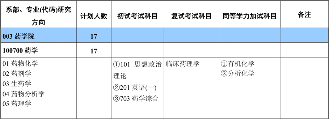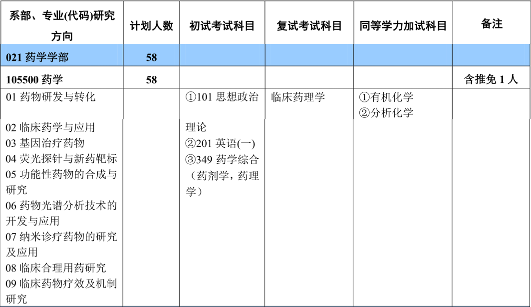 学院药学一级学科硕士学位(1007)授权点按照药物化学、药理学、药剂学、药物分析学、生药学5个二级学科方向进行招生;药学硕士专业学位(1055)授权点按照临床药学及应用、药物研发及转化方向进行招生;药学学部的01药物研发与转化和02临床药学与应用两个方向在药学院培养,03—09七个方向在学校其他院系培养。
