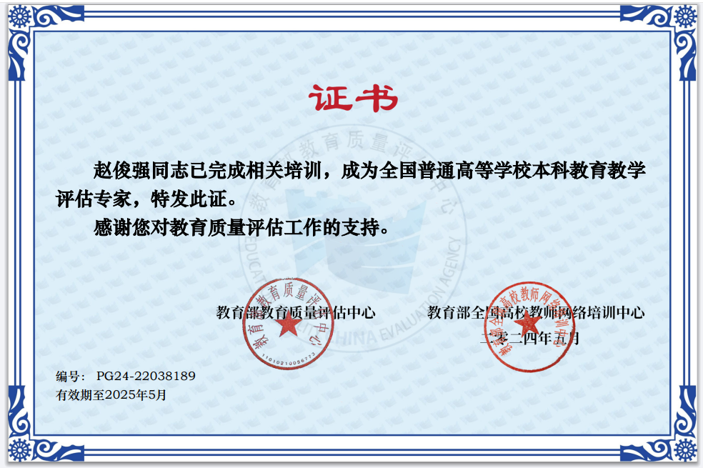 日前,我院赵俊强教授经普通高等学校本科教育教学评估专家入库培训合格后,入选全国普通高等学校本科教育教学审核评估专家。