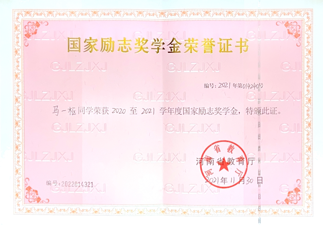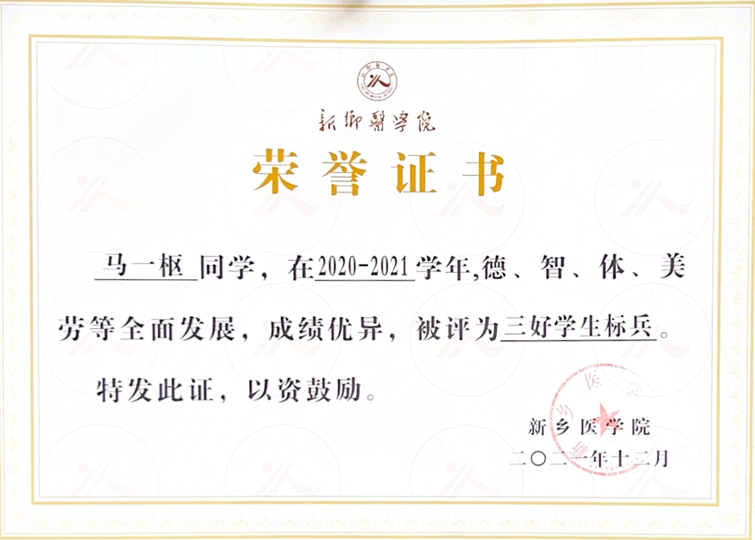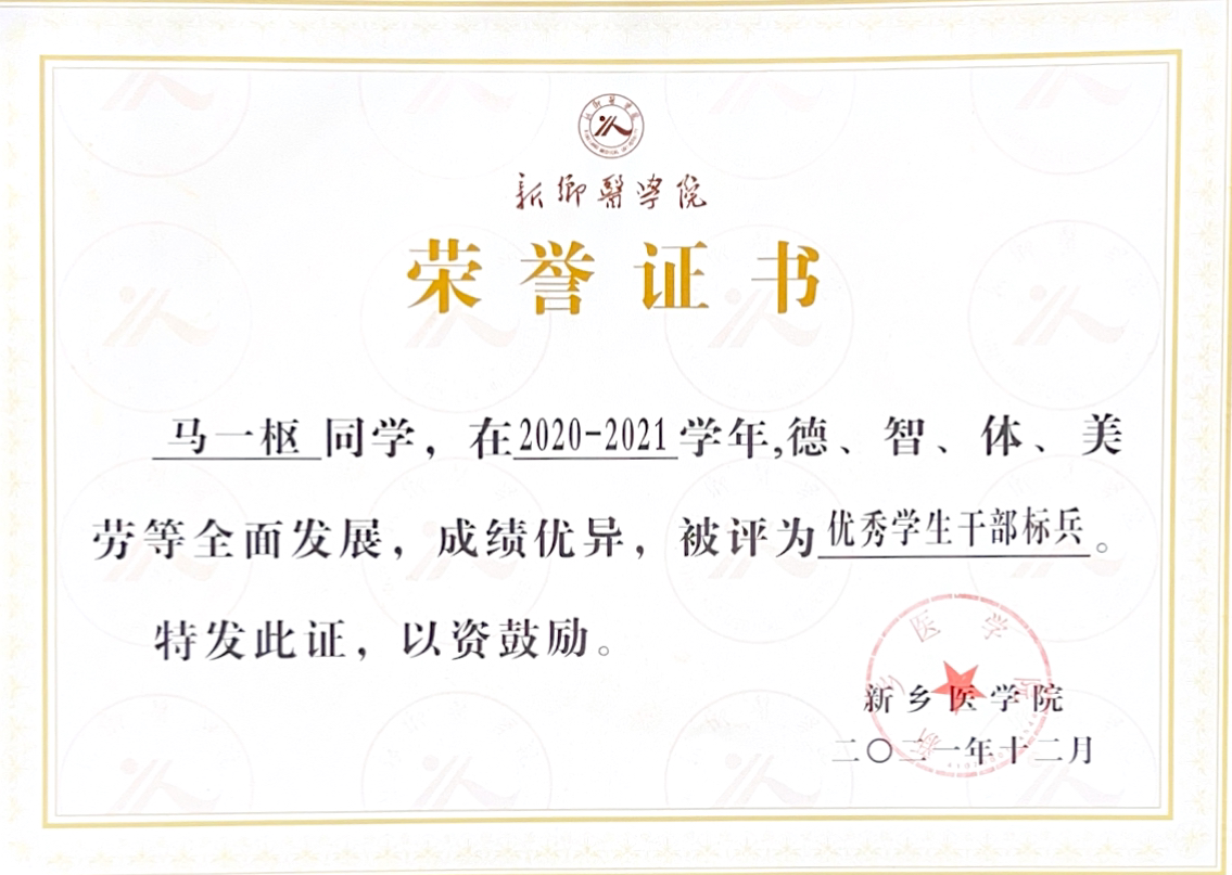 该生学习认真学习,刻苦钻研,在校期间获得“国家励志奖学金”、“校级优秀奖学金一等奖”。综合能力表现突出,在学生中积极起到模范带头作用,获得2023年“河南省优秀学生干部”、华亿在线手机版(大中国区)“文明学生”、华亿在线手机版(大中国区)“优秀团干部”、华亿在线手机版(大中国区)“三好学生标兵”及“优秀学生干部标兵”等荣誉。曾担任2019级医学影像学01班班长,班级曾多次获得校“文明班级”、“五好红旗团支部”等荣誉。