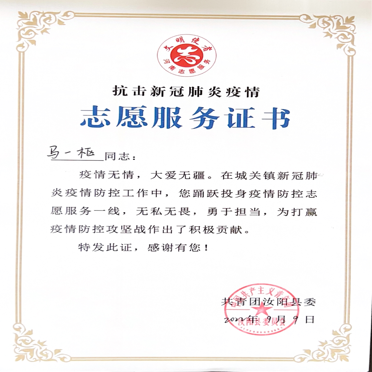 新冠肺炎疫情期间,该生积极发挥党员模范作用,在家乡主动联系社区和当地卫健委,向基层报到,积极加入基层抗疫志愿服务活动中,参与当地疫情防控和卫健委疫情防控办公室日常数据排查追踪工作,多次获得当地部门的证书嘉奖。在学校封闭管理期间,该生敢于担当,发挥学生干部和党员的作用,努力安抚同学们情绪,配合执行各项疫情防控工作,曾多次获得“优秀志愿者”称号。
