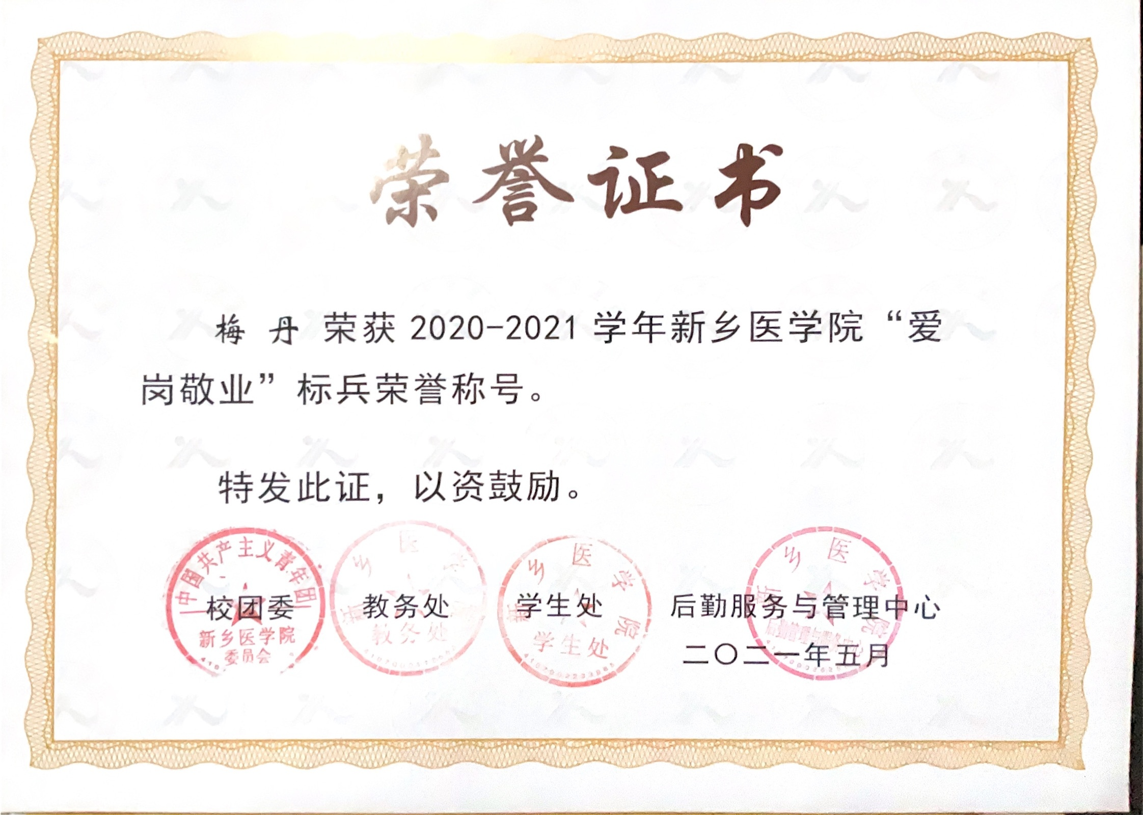 在工作方面,发挥党员的先锋模范带头作用,以饱满的热情、严谨的态度投入工作,做好辅导员与同学们沟通的桥梁,获得同学们的一致好评。时刻牢记职责,脚踏实地,始终贯彻“为人民服务”的宗旨,爱岗敬业,诚信友善。曾参加第四期学生干部“菁英训练营”培训合格,收获颇丰,对学生工作的处理及与班干部的协调统筹等方面有了很大提升。获得“河南省优秀学生干部”称号,连续三年获得校级“优秀学生干部”称号,连续两年获得“爱岗敬业”标兵荣誉称号。