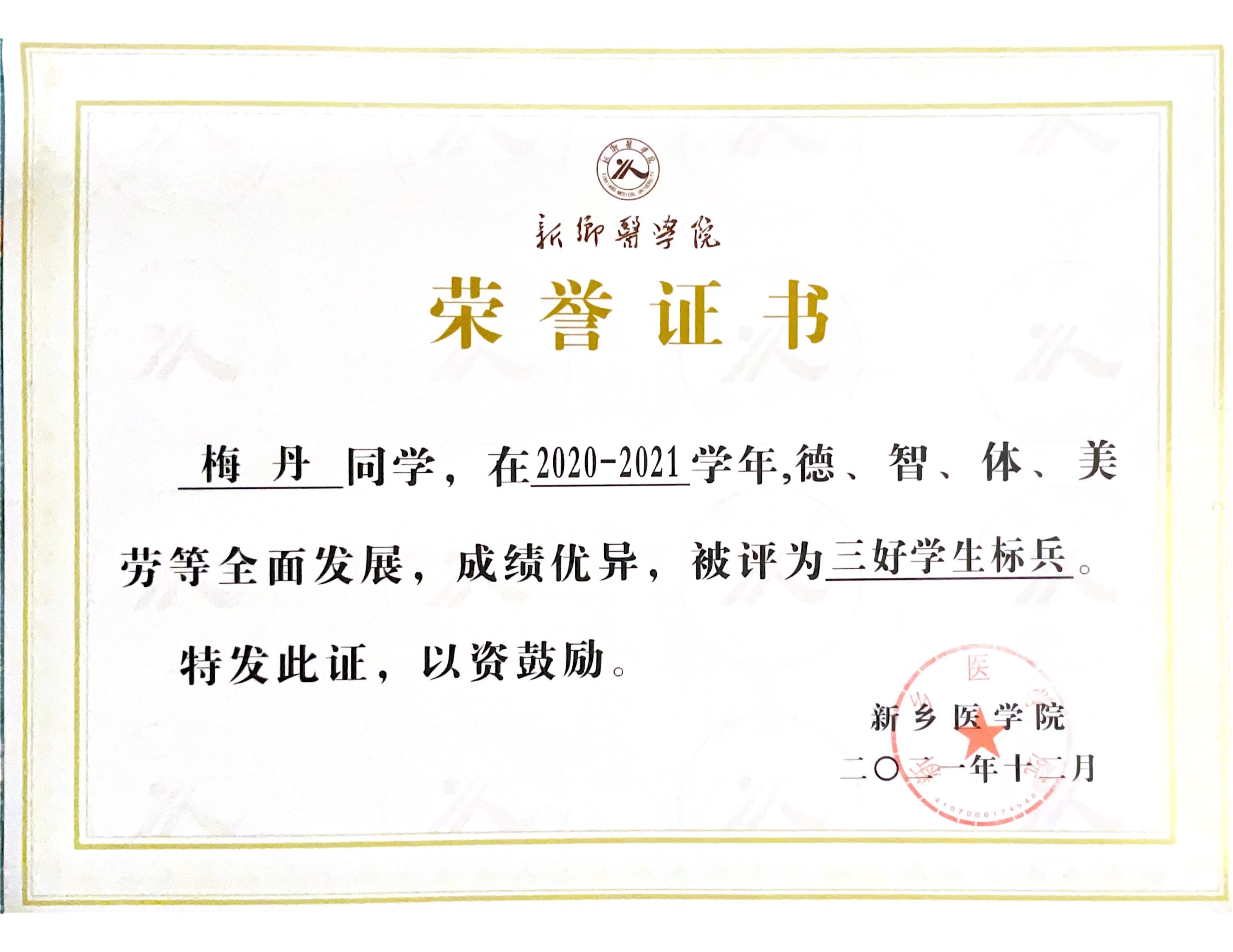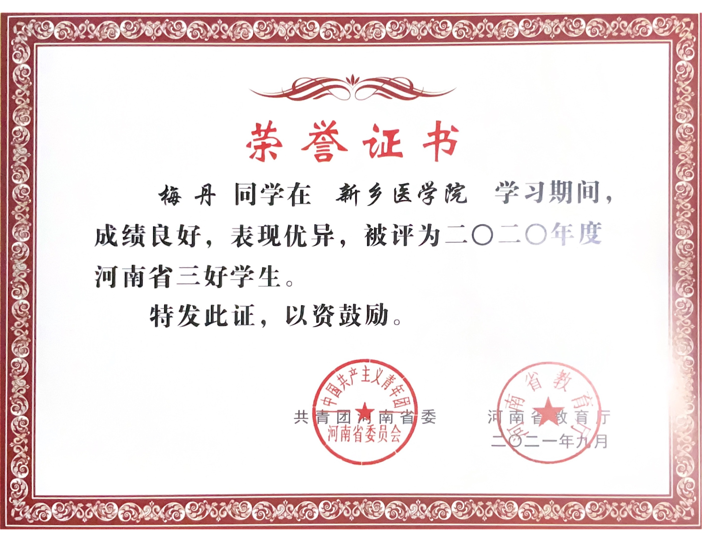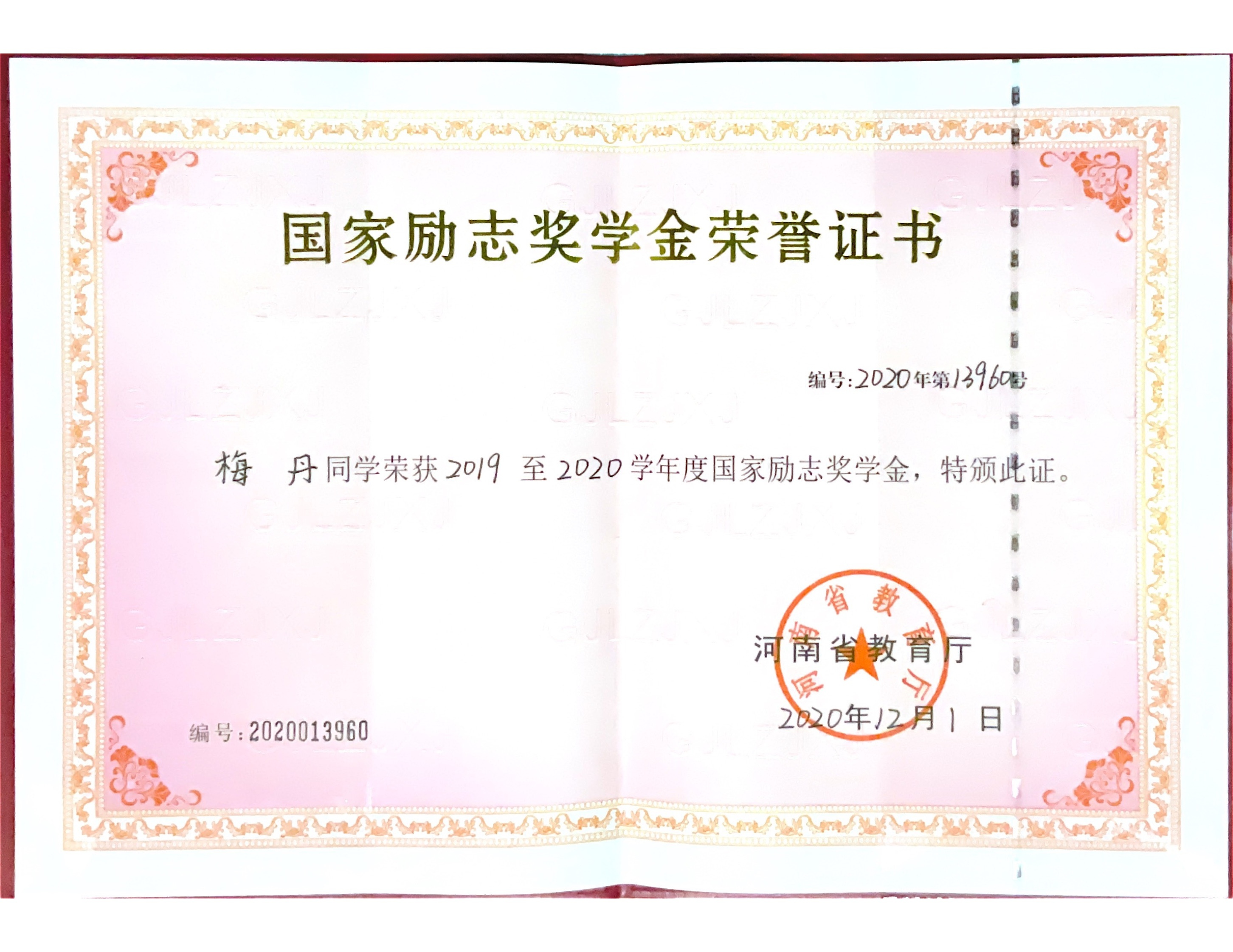 在学习方面,认真学习文化知识,学习目标明确,平时积极与老师同学们探讨交流,曾多次获得国家励志奖学金、校级一等奖学金,获得“河南省三好学生”、校级“三好学生标兵”等荣誉称号,以身作则,为同学们起到良好带头模范作用。在生活方面,具有良好的道德品质和行为习惯,生活朴素,坦诚乐观,明大德、守公德,尊敬师长,团结同学,积极参与各类文体活动,曾获得“华亿在线手机版(大中国区)第十四届大学生文化艺术节歌手大赛一等奖”等文体类奖项。主动参与志愿者活动,暑期于线上为新生答疑解惑,开学时于院系报道台处引导新生有序报道,曾获得校级“优秀志愿者”称号。