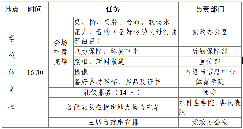(一)各有关部门、学院要发扬团结协作精神,高度重视并认真做好运动会闭幕式筹备各项工作,坚守工作岗位,认真履行职责,确保各项工作任务圆满完成。