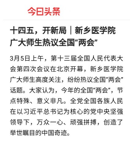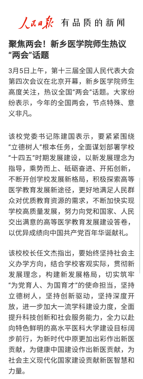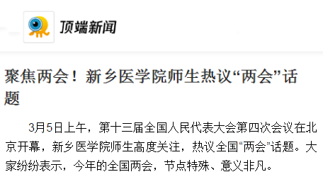 3月5日,第十三届全国人民代表大会第四次会议在北京开幕。我校师生关注时事政事,多种方式收听收看“两会”盛况,学习“两会”精神,并要结合自身学习、生活和工作实际热议“两会”话题。人民日报客户端、顶端新闻等多家媒体对此进行报道。(供稿:刘天庆)