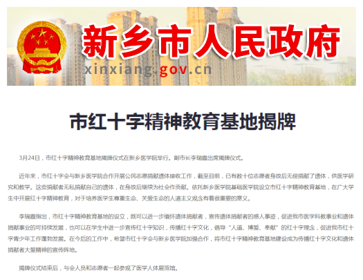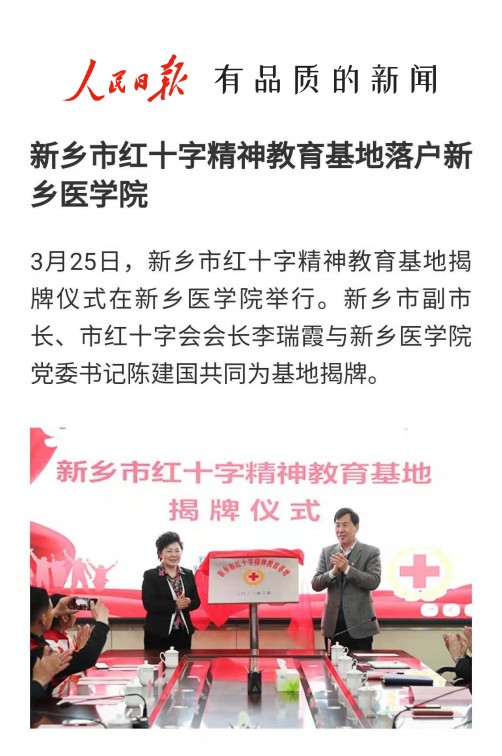日前,新乡市红十字精神教育基地揭牌仪式在我校举行。新乡市副市长、市红十字会会长李瑞霞与校党委书记陈建国共同为基地揭牌。基地的建立既是对红十字精神在一代代新医人之间薪火相传的肯定,也是对培养学生树立正确人生观,提高社会责任感,厚植家国情怀的有力引导。