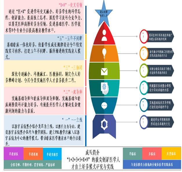 经过10余年的持续改革实践,构建了“1+2+3+5+X+N”的人才培养模式,即“基于岗位胜任力模型,以器官系统为一条主线,基础临床双导师制,通专融合、科教融汇、医教协同三融合,五育并举、五年不间断全程实践,拓展医学+X交叉融合培养菁英医师引领突破、N个专业总结推广、教育水平全面提升”的拔尖创新医学人才自主培养模式,为新医科在国内医学院校的落地提供了有益借鉴。