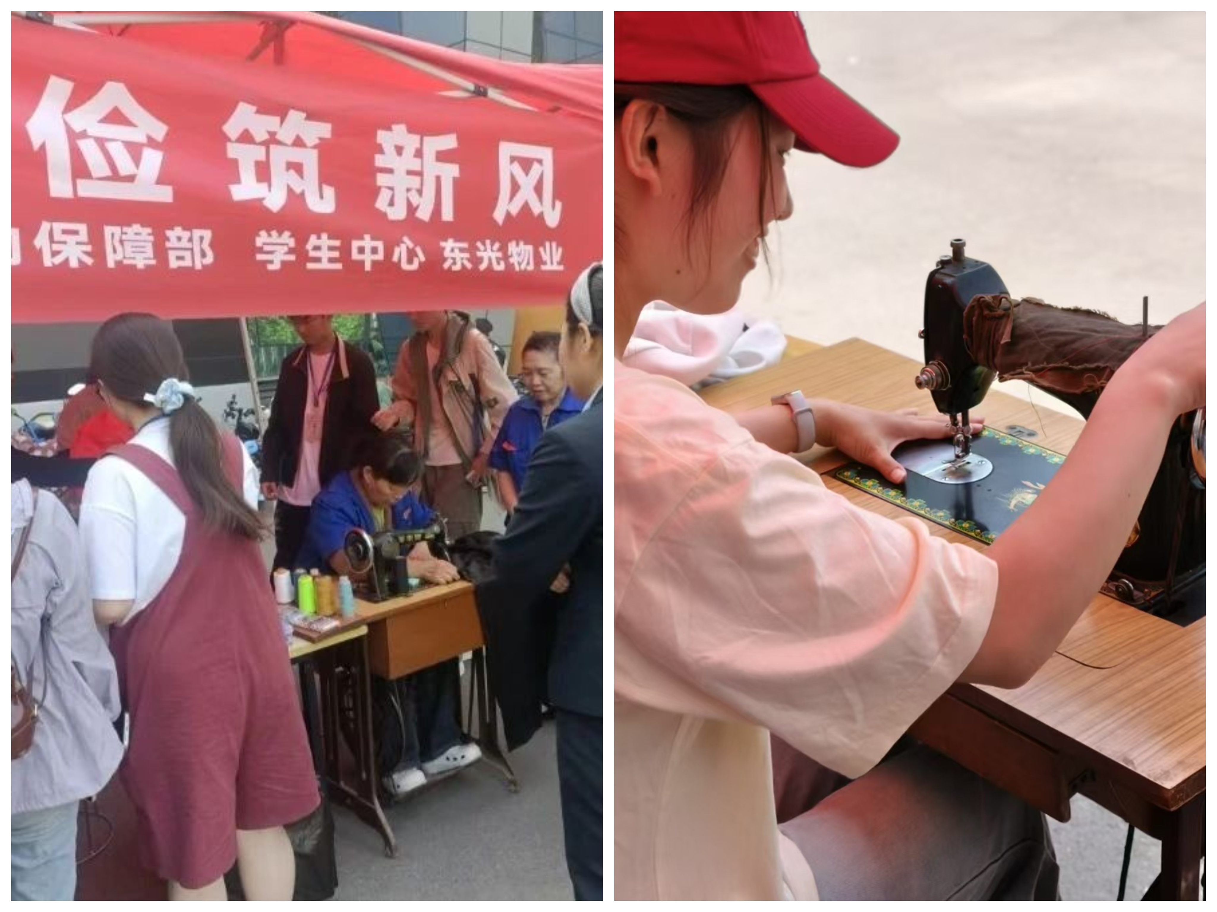 活动现场划分为功能鲜明的三大区域:便民服务站化身"校园裁缝铺",物业员工与学生志愿者组成的"巧手团队"为师生提供专业缝补服务,从钉纽扣到改衣型,服务细致入微;技能教学区变身"手作工坊",专业技工现场示范平针、回针等基础针法,两台缝纫机前围满跃跃欲试的学子;互动分享区则成为"匠心讲堂",通过"巧手阿姨经验谈""旧物改造创意展"等环节,让传统手艺焕发新生机。