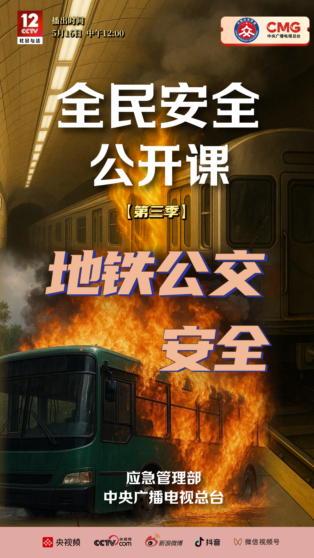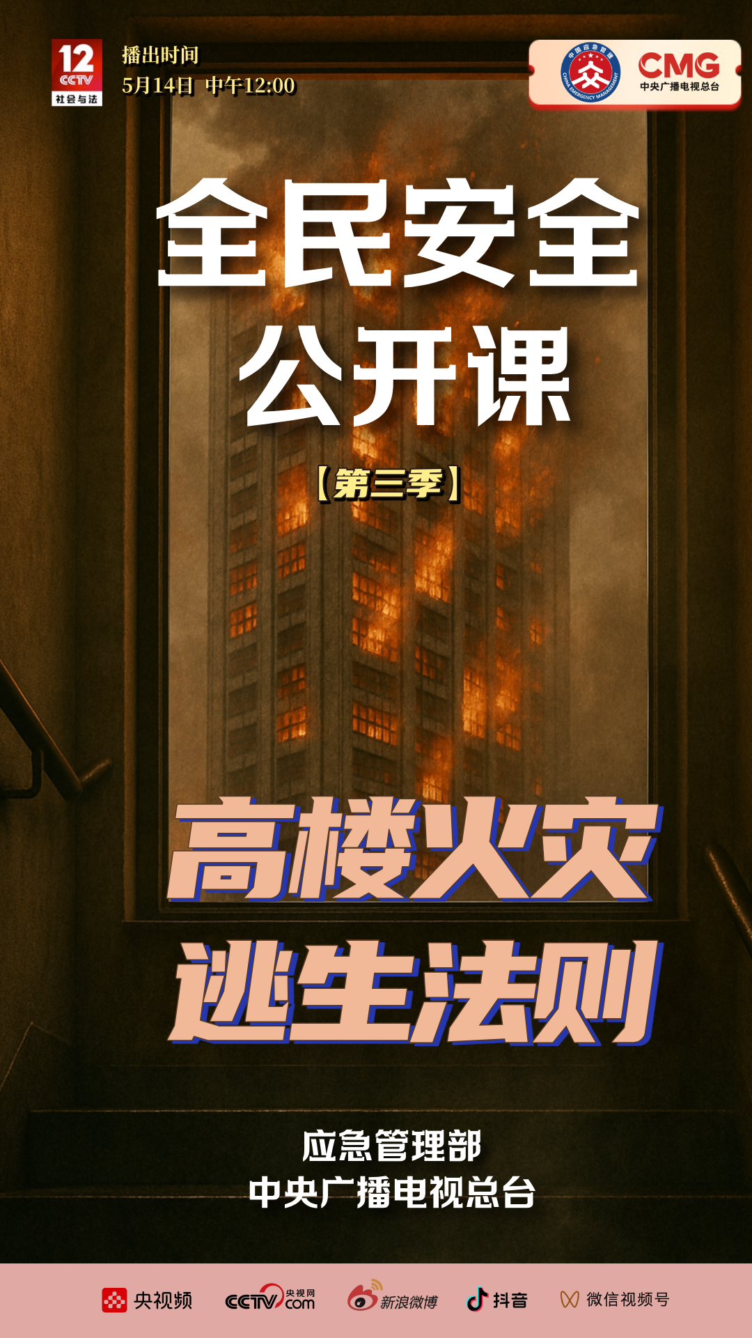 应急管理部与中央广播电视总台联合制作《全民安全公开课》第三季系列节目,将于5月12日至16日每天午间12:00在央视社会与法频道CCTV -12《生命线》栏目播出,该系列节目围绕汛期防溺水、森林草原防灭火、高楼火灾逃生、电梯安全、地铁公交安全五大主题,带领观众走进广西、天津等地,应急科普教育基地火灾纪念馆消防研究所等场所,针对性普及应急安全知识和避险自救技能,推动实现"人人讲安全、个个会应急"。