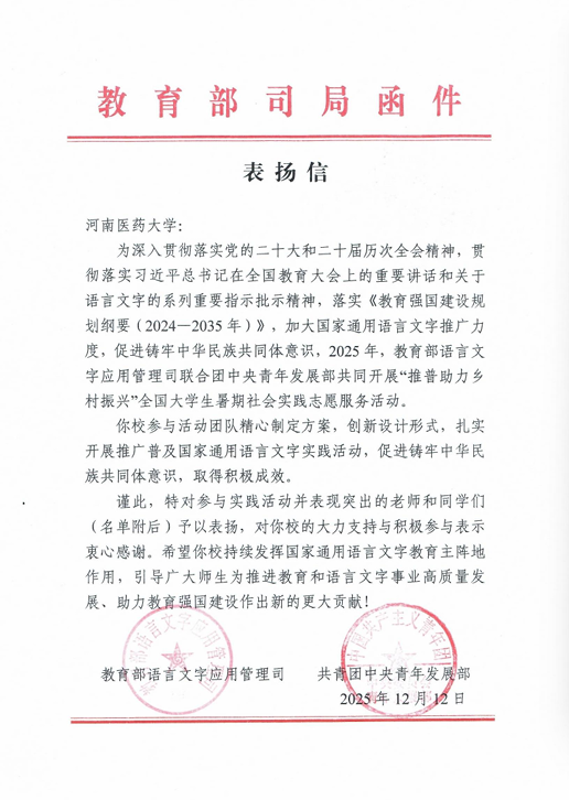 近日,由教育部语言文字应用管理司、共青团中央青年发展部联合开展的2025年“推普助力乡村振兴”全国大学生暑期社会实践志愿服务活动评选结果揭晓,我院与医学技术学院共同指导的“‘乡’约新声,‘语’你同行”实践团队从全国1680所高校的8013支团队中脱颖而出,获评全国优秀团队,教育部语言文字应用管理司和共青团中央青年发展部来信表扬。