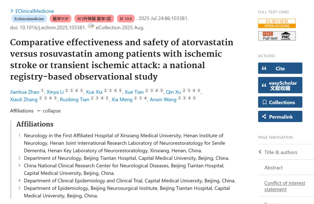近日,我校第一附属医院脑科医院院长赵建华科研团队在国际权威期刊The Lancet子刊EClinicalMedicine(中国科学院一区Top期刊,影响因子为10.0)上发表题为“Comparative effectiveness and safety of atorvastatin versus rosuvastatin among patients with ischemic stroke or transient ischemic attack: a national registry-based observational study”的研究成果,并被列为当期重点推荐论文。该研究由赵建华科研团队联合首都医科大学天坛医院王安心科研团队共同完成,赵建华为论文第一作者。