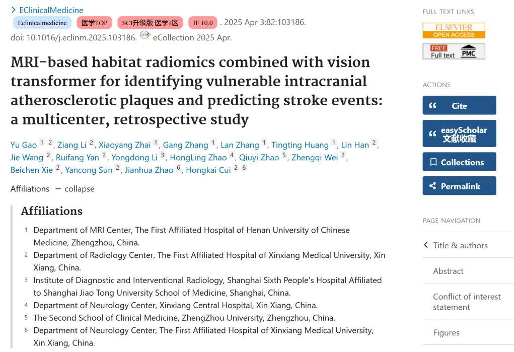 据悉,赵建华科研团队联合神经介入放射学崔红凯科研团队于今年4月也在EClinicalMedicine发表了题为“MRI-based habitat radiomics combined with vision transformer for identifying vulnerable intracranial atherosclerotic plaques and predicting stroke events: a multicenter, retrospective study”的研究论文。该研究通过融合高分辨率血管壁成像、栖息地影像组学和视觉自注意力模型技术,开发出新型AI模型。此模型能精准识别颅内动脉易损斑块并预测卒中复发风险,为卒中高危人群筛查提供了新方法。