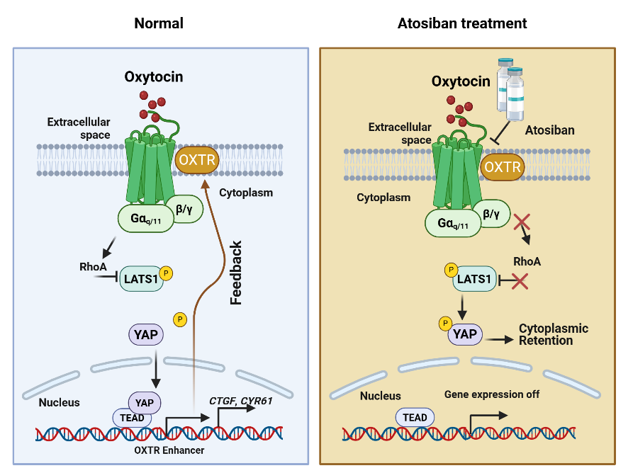 肝细胞癌(HCC)侵袭性强、恶性高、预后差。研究显示Hippo通路中关键效应分子YAP的过度活化可促进HCC的进展。据报道,超过30%的临床药物通过靶向G蛋白偶联受体(GPCRs)发挥作用。因此,GPCRs对Hippo/YAP信号通路的转导调控研究不仅具有重要的基础研究价值,也展现出潜在的临床应用前景。本研究以筛选已有临床靶向药物的GPCRs调控Hippo/YAP通路活性为切入点,通过一些类细胞分子生物学实验、转基因小鼠、肝原位种植、类器官和Patien-derived explants(PDE)模型等技术,明确了缩宫素受体OXTR通过Gαq/11/Hippo/YAP促进肝癌进展的新机制;阐明了OXTR与YAP之间的正反馈调控;揭示了OXTR拮抗剂阿托西班,一种临床新型的保胎药物,通过靶向阻断OXTR-YAP的正反馈协同作用,可能成为肝癌治疗的新的方向,为临床老药增添了新的活力。