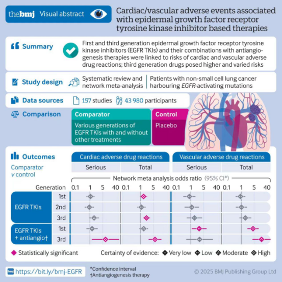 该研究通过网状meta分析方法,系统评估不同EGFR TKI治疗方案与心脏及血管不良事件风险的关联,旨在为肿瘤心脏病学指南(包括ESC最新版指南)的制定和更新提供高质量循证医学依据。该研究主要发现在表皮生长因子受体(EGFR)突变的非小细胞肺癌(NSCLC)患者中,第一代与第三代EGFR酪氨酸激酶抑制剂(TKIs)及其联合抗血管生成治疗方案,可能诱发不同程度的心脏及血管药物不良反应。相较于第一代EGFR TKIs,第三代EGFR TKIs具有更高的心血管风险,且其心脏或血管毒性谱存在显著差异。基于上述发现,这项研究建议临床医生在治疗期间加强心血管系统监测、优化药物选择策略,识别高危患者亚群以指导个体化治疗。