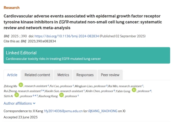 9月2日,我校第一附属医院学术副院长康小红教授团队在国际顶级医学期刊《英国医学杂志》(The BMJ)正式发表题为“Cardiovascular adverse events associated with epidermal growth factor receptor tyrosine kinase inhibitors in EGFR-mutated non-small cell lung cancer: systematic review and network meta-analysis”(EGFR突变非小细胞肺癌中EGFR-TKIs治疗相关的心血管不良事件:系统综述和网状meta分析)的重要研究成果,该研究由康小红教授与广州医科大学附属脑科医院艾思志教授、上海中医药大学附属岳阳中西医结合医院龚亚斌教授担任共同通讯作者,我校第一附属医院为论文的第一完成单位。此项成绩实现了我校第一附属医院在世界顶级医学期刊发表研究成果“零的突破”,是医院科研实力和历史底蕴的彰显。