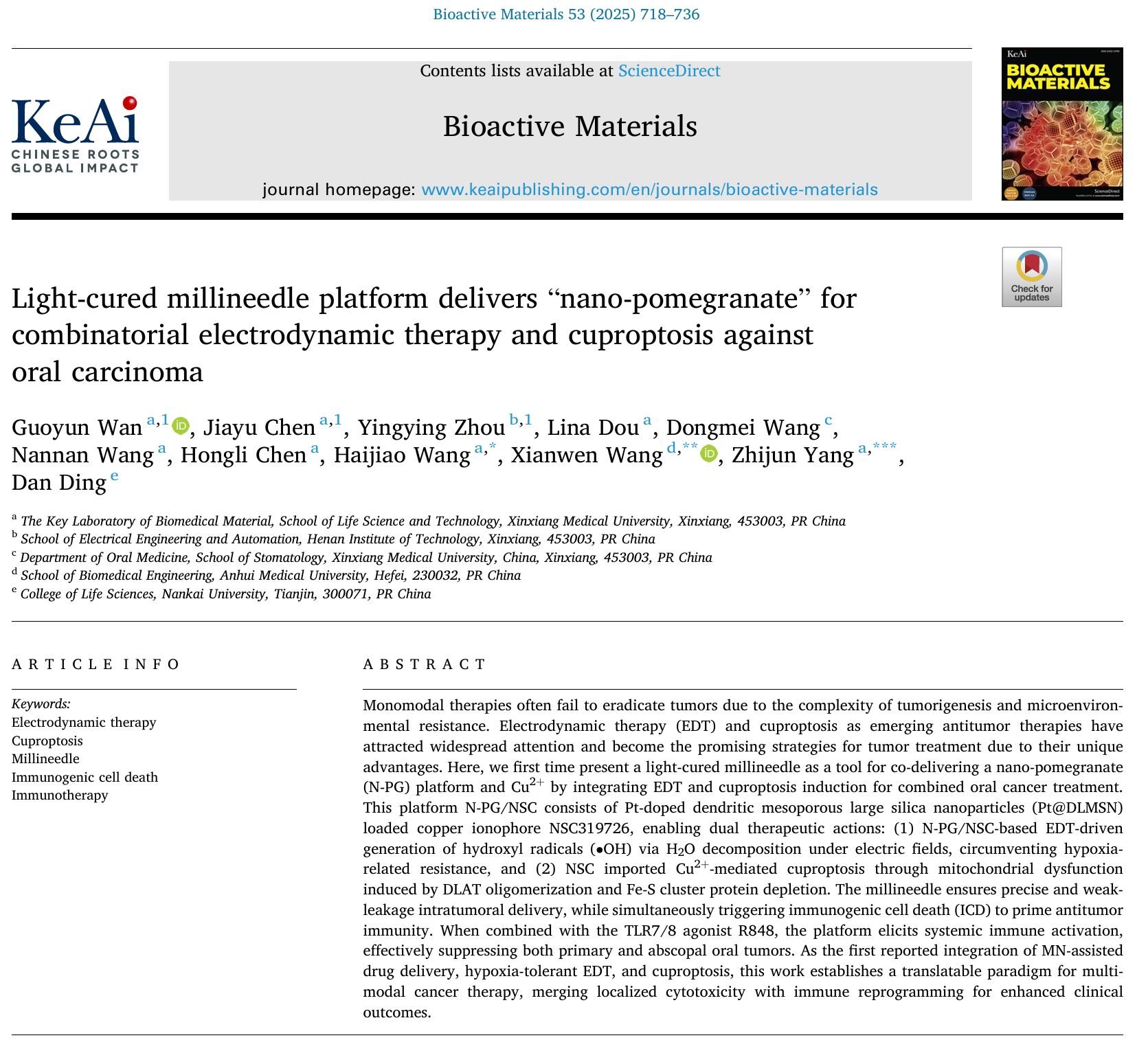近日,生命科学技术学院纳米生物医用材料研究中心万国运、王海蛟博士等在Bioactive Materials期刊上发表题为“Light-Cured Millineedle Platform Delivers "Nano-Pomegranate" for Combinatorial Electrodynamic Therapy and Cuproptosis Against Oral Carcinoma”的研究论文,万国运博士,22级研究生陈嘉玉和河南工学院周迎迎讲师为共同第一作者,我校杨志军教授,王海蛟副教授和安徽医科大学王咸文教授为共同通讯作者,我校为第一作者单位和第一通迅单位。