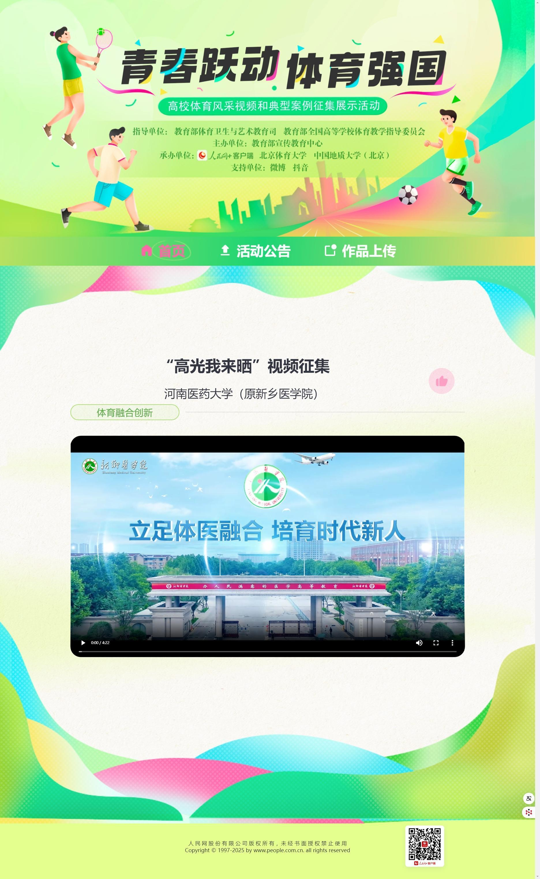 近日,由教育部体育卫生与艺术教育司、教育部全国高等学校体育教学指导委员会指导,教育部宣传教育中心主办,北京体育大学、中国地质大学(北京)与“人民网+”客户端共同承办的高校体育风采视频和典型案例征集展示活动,正式完成遴选并开启线上展播。我校体育学院制作的作品《立足体医融合 培育时代新人》,经省教育厅通知部署、校内申报及省级推荐,成功入选全国100个视频作品之列,于9月10日起在“人民网+”客户端集中展示,向全国观众呈现我校体育育人的特色成果与精神风貌。