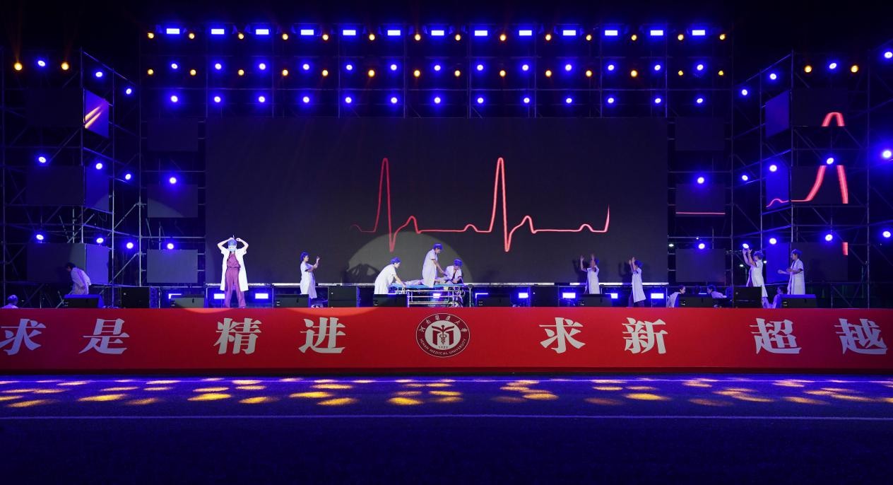第一篇章为“志存高远·起航”。大学生合唱团演唱的《初心与恒心》传递出青年一代对理想坚定不移的追求;大学生艺术团的舞蹈《一条大河》以磅礴气势展现锚定目标、勇毅前行的决心;朗诵节目《医路同行,药启新程》聚焦医学生的志向担当,勾勒出青年学子奋发有为的志向底色。