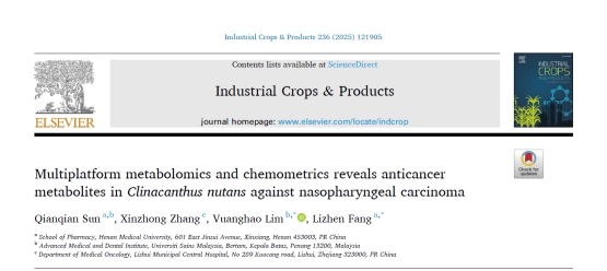 近日,我校药学院药物化学团队在国际权威期刊Industrial Crops and Products上发表题为“Multiplatform metabolomics and chemometrics reveals anticancer metabolites inClinacanthus nutansagainst nasopharyngeal carcinoma”的研究论文,我校药学院为本研究第一通讯单位,博士研究生孙倩倩为第一作者,导师房立真教授和Vuanghao Lim (林望高)教授为共同通讯作者。该研究受河南省科技创新领军人才、河南省特聘教授支持计划等项目的支持。